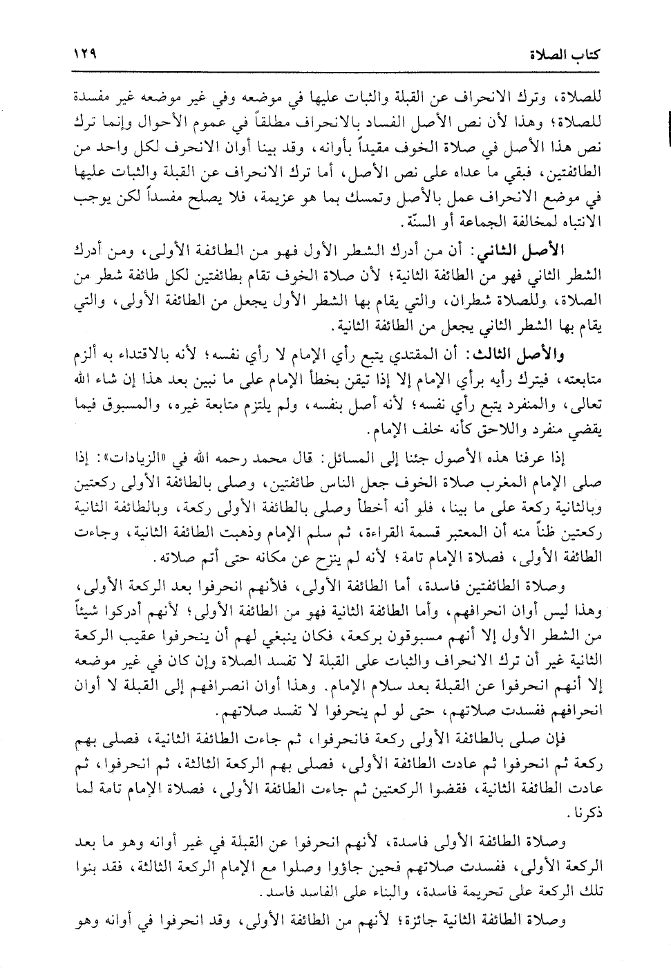 للصلاة، وترك الانحراف عن القبلة والثبات عليها في موضعه وفي غير موضعه غير مفسدة للصلاة؛ وهذا لأن نص الأصل الفساد بالانحراف مطلقاً في عموم الأحوال وإنما ترك نص هذا الأصل في صلاة الخوف مقيداً بأوانه، وقد بينا أوان الانحرف لكل واحد من الطائفتين، فبقي ما عداه على نص الأصل، أما ترك الانحراف عن القبلة والثبات عليها في موضع الانحراف عمل بالأصل وتمسك بما هو عزيمة، فلا يصلح مفسداً لكن يوجب الانتباه لمخالفة الجماعة أو السنّة.