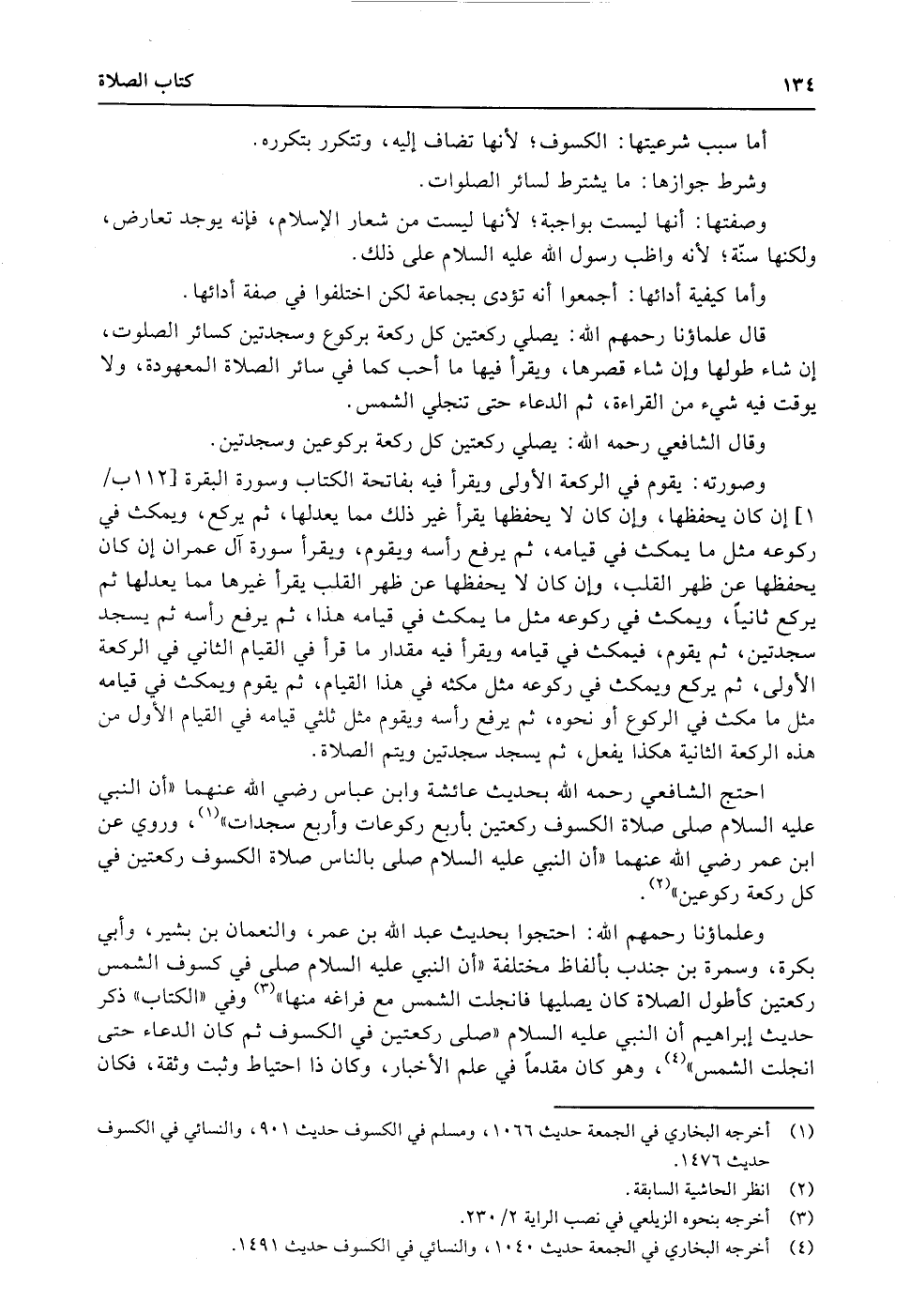 وعلماؤنا رحمهم الله: احتجوا بحديث عبد الله بن عمر، والنعمان بن بشير، وأبي بكرة، وسمرة بن جندب بألفاظ مختلفة «أن النبي عليه السلام صلى في كسوف الشمس ركعتين كأطول الصلاة كان يصليها فانجلت الشمس مع فراغه منها» وفي «الكتاب» ذكر حديث إبراهيم أن النبي عليه السلام «صلى ركعتين في الكسوف ثم كان الدعاء حتى انجلت الشمس» ، وهو كان مقدماً في علم الأخبار، وكان ذا احتياط وثبت وثقة، فكان