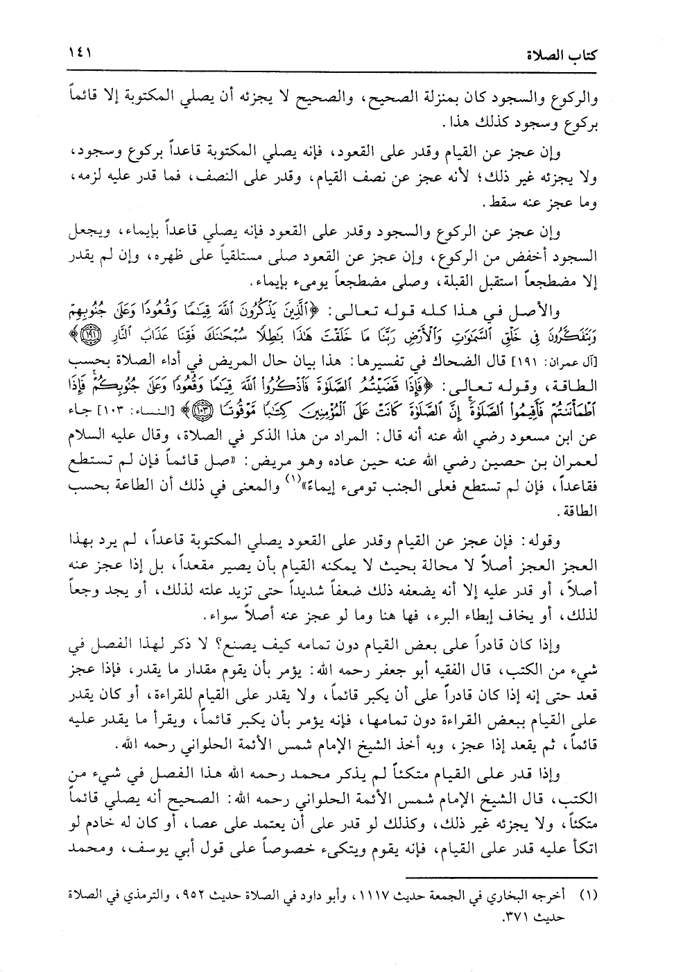 والأصل في هذا كله قوله تعالى: {الَّذِينَ يَذْكُرُونَ اللَّهَ قِيَماً وَقُعُوداً وَعَلَى جُنُوبِهِمْ وَيَتَفَكَّرُونَ فِى خَلْقِ السَّمَوتِ وَالاْرْضِ رَبَّنَآ مَا خَلَقْتَ هَذا بَطِلاً سُبْحَنَكَ فَقِنَا عَذَابَ النَّارِ} (آل عمران: 191) قال الضحاك في تفسيرها: هذا بيان حال المريض في أداء الصلاة بحسب الطاقة، وقوله تعالى: {فَإِذَا قَضَيْتُمُ الصَّلَوةَ فَاذْكُرُواْ اللَّهَ قِيَماً وَقُعُوداً وَعَلَى جُنُوبِكُمْ فَإِذَا اطْمَأْنَنتُمْ فَأَقِيمُواْ الصَّلَوةَ إِنَّ الصَّلَوةَ كَانَتْ عَلَى الْمُؤْمِنِينَ كِتَباً مَّوْقُوتاً} (النساء: 103) جاء عن ابن مسعود رضي الله عنه أنه قال: المراد من هذا الذكر في الصلاة، وقال عليه السلام لعمران بن حصين رضي الله عنه حين عاده وهو مريض: «صل قائماً فإن لم تستطع فقاعداً، فإن لم تستطع فعلى الجنب تومىء إيماءً» والمعنى في ذلك أن الطاعة بحسب الطاقة.