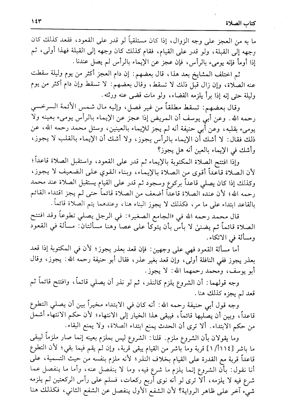 وقال بعضهم: تسقط مطلقاً من غير فصل، وإليه مال شمس الأئمة السرخسي رحمه الله. وعن أبي يوسف أن المريض إذا عجز عن الإيماء بالرأس يومىء بعينه ولا يومىء بقلبه، وعن أبي حنيفة أنه لم يجز للإيماء بالعينين، وسئل محمد رحمه الله، عن ذلك فقال: لا أشك أن الإيماء بالرأس يجوز، ولا أشك أن الإيماء بالقلب لا يجوز، وأشك في الإيماء بالعين أنه هل يجوز؟