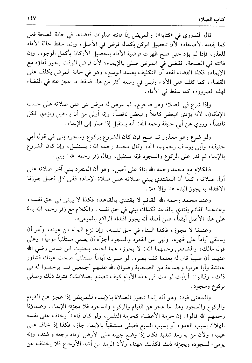 قال القدوري في «كتابه» : والمريض إذا فاتته صلوات فقضاها في حالة الصحة فعل كما يفعله الأصحاء؛ لأن تحصيل الركن بكماله فرض في الأصل، وإنما سقط حالة الأداء للعذر، فإذا لم يؤد حتى صح ظهرت فرضية الأداء بتحصيل الأركان بأكمل الوجوه. وإن فاتته في الصحة، فقضى في المرض صلى بالإيماء؛ لأن فرض الوقت يجوز أداؤه مع الإيماء، فكذا القضاء لفقه أن التكليف يعتمد الوسع، وهو في حالة المرض يكلف على القضاء، كما كلف على الأداء وليس في وسعه أكثر من هذا فسقط ما عجز عنه في القضاء لهذه الضرورة، كما سقط في الأداء.