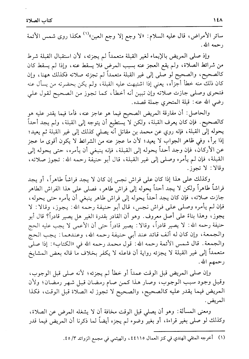 وإذ صلى المريض بالإيماء لغير القبلة متعمداً لم يجزئه، لأن استقبال القبلة شرط من شرائط الصلاة، ولم يقع العجز عنه بسبب المرض فلا يسقط عنه، وإذا لم يسقط كان كالصحيح، والصحيح لو صلى إلى غير القبلة متعمداً لم تجزئه صلاته فكذلك ههنا، وإن كان ذلك منه خطأ أجزأه، يعني إذا اشتبهت عليه القبلة، ولم يكن بحضرته من يسأل عنه فتحرى وصلى جازت صلاته وإن تبين أنه أخطأ، كما تجوز من الصحيح لقول علي رضي الله عنه: قبلة المتحري جملة قصده.