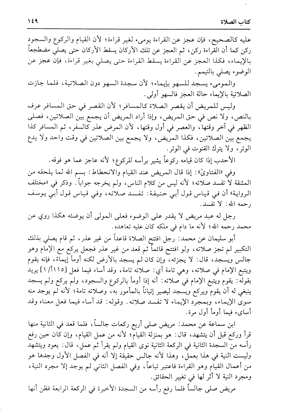 ابن سماعة عن محمد: مريض صلى أربع ركعات جالساً، فلما قعد في الثانية منها قرأ وركع قبل أن يتشهد، قال: هو بمنزلة القيام؛ لأنه من عمل القيام، وإن كان حين رفع رأسه من السجدة الثانية في الركعة الثانية نوى القيام ولم يقرأ ثم عمل، قال: يعود ويتشهد وليست النية في هذا بعمل، وهذا لأنه جالس حقيقة إلا أنه في الفصل الأول وجدها هو من أعمال القيام وهو القراءة فاعتبر تباعاً، وفي الفصل الثاني لم يوجد إلا مجرد النية، ومجرد النية لا أثر لها في تغيير الحقائق.