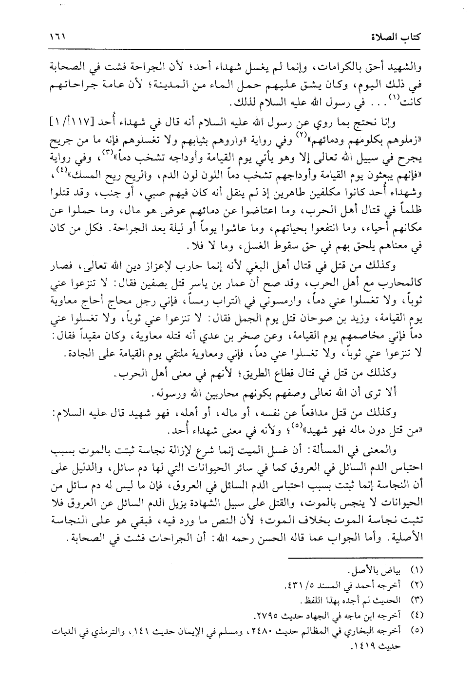 وإنا نحتج بما روي عن رسول الله عليه السلام أنه قال في شهداء أُحد (117أ1) «زملوهم بكلومهم ودمائهم» وفي رواية «واروهم بثيابهم ولا تغسلوهم فإنه ما من جريح يجرح في سبيل الله تعالى إلا وهو يأتي يوم القيامة وأوداجه تشخب دماً» ، وفي رواية «فإنهم يبعثون يوم القيامة وأوداجهم تشخب دماً اللون لون الدم، والريح ريح المسك» ، وشهداء أُحد كانوا مكلفين طاهرين إذ لم ينقل أنه كان فيهم صبي، أو جنب، وقد قتلوا ظلماً في قتال أهل الحرب، وما اعتاضوا عن دمائهم عوض هو مال، وما حملوا عن مكانهم أحياء، وما انتفعوا بحياتهم، وما عاشوا يوماً أو ليلة بعد الجراحة. فكل من كان في معناهم يلحق بهم في حق سقوط الغسل، وما لا فلا.