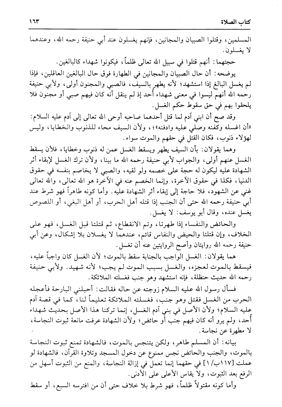 يوضحه: أن حال الصبيان والمجانين في الطهارة فوق حال البالغين العاقلين، فإذا لم يغسل البالغ إذا استشهد؛ لأنه يطهر بالسيف، فالصبي والمجنون أولى، ولأبي حنيفة رحمه الله أنهم ليسوا في معنى شهداء أُحد إذ لم ينقل أنه كان فيهم صبي أو مجنون فلا يلحقوا بهم في حق سقوط حكم الغسل.