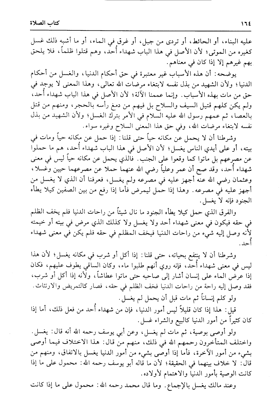 وشرطنا أن لا ينتفع بحياته، حتى قلنا: إذا أكل أو شرب في مكانه يغسل؛ لأن هذا ليس في معنى شهداء أُحد، فإنه روي أنهم طلبوا ماء، وكان الساقي يطوف عليهم، فكان إذا عرض الماء على إنسان أشار إلى صاحبه حتى ماتوا عطاشاً، ولأنه إذا أكل أو شرب، فقد وصل إليه راحة من راحات الدنيا فخف الظلم في حقه، فصار كالتمريض والارتثاث.