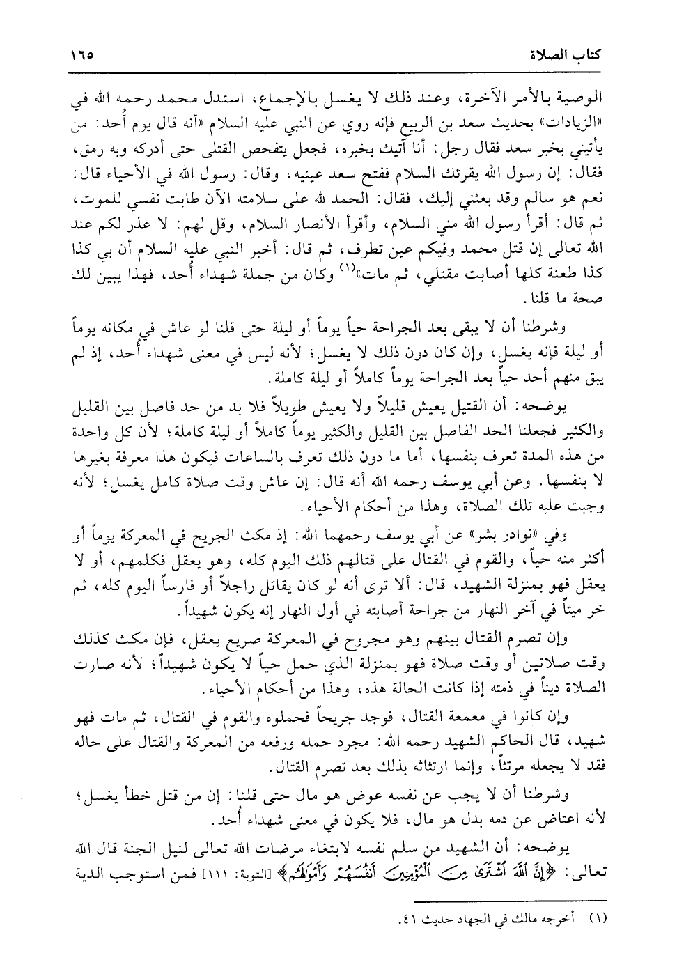 الوصية بالأمر الآخرة، وعند ذلك لا يغسل بالإجماع، استدل محمد رحمه الله في «الزيادات» بحديث سعد بن الربيع فإنه روي عن النبي عليه السلام «أنه قال يوم أُحد: «من يأتيني بخبر سعد فقال رجل: أنا آتيك بخبره، فجعل يتفحص القتلى حتى أدركه وبه رمق، فقال: إن رسول الله يقرئك السلام ففتح سعد عينيه، وقال: رسول الله في الأحياء قال: نعم هو سالم وقد بعثني إليك، فقال: الحمد لله على سلامته الآن طابت نفسي للموت، ثم قال: أقرأ رسول الله مني السلام، وأقرأ الأنصار السلام، وقل لهم: لا عذر لكم عند الله تعالى إن قتل محمد وفيكم عين تطرف، ثم قال: أخبر النبي عليه السلام أن بي كذا كذا طعنة كلها أصابت مقتلي، ثم مات» وكان من جملة شهداء أُحد، فهذا يبين لك صحة ما قلنا.