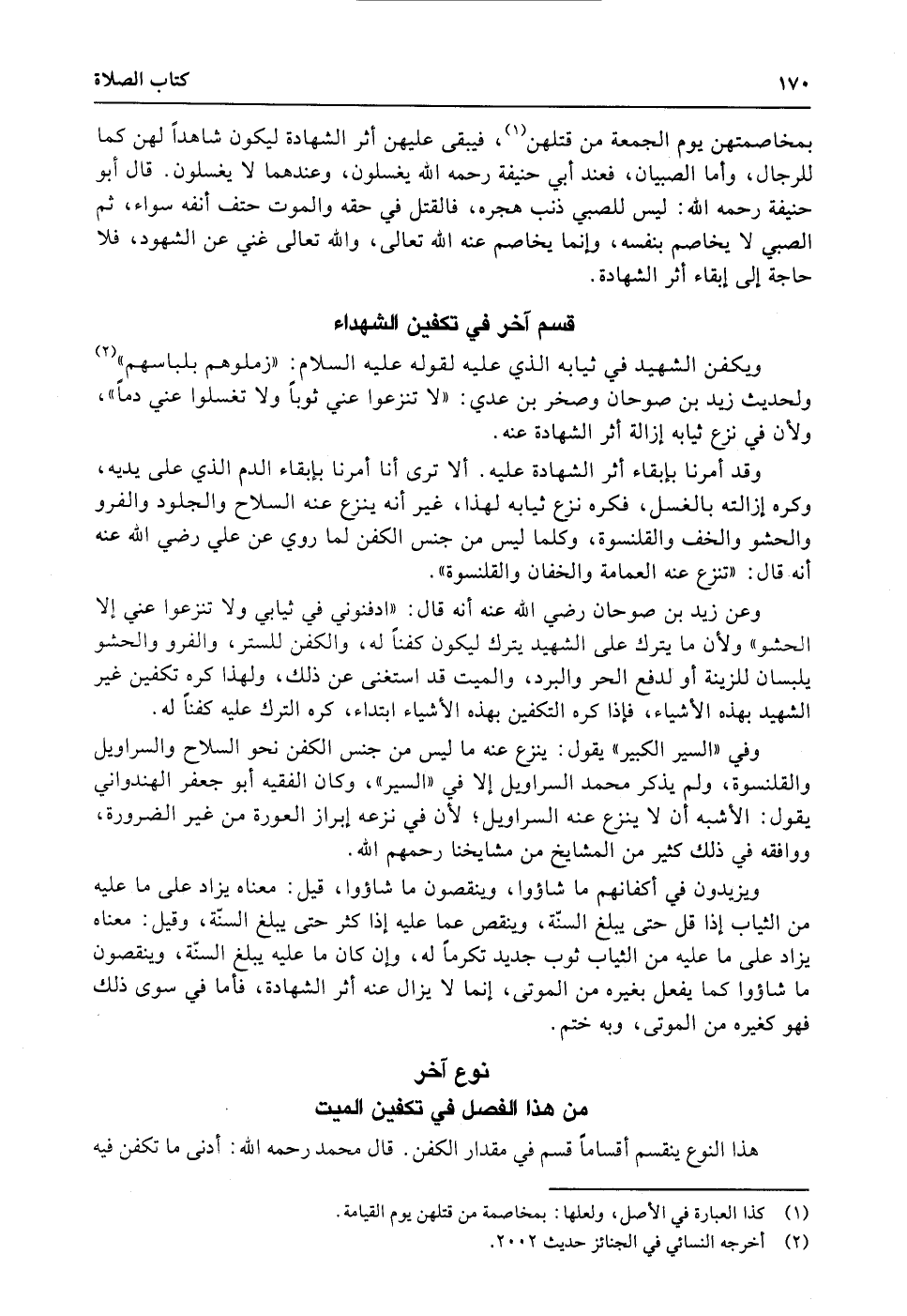 وفي «السير الكبير» يقول: ينزع عنه ما ليس من جنس الكفن نحو السلاح والسراويل والقلنسوة، ولم يذكر محمد السراويل إلا في «السير» ، وكان الفقيه أبو جعفر الهندواني يقول: الأشبه أن لا ينزع عنه السراويل؛ لأن في نزعه إبراز العورة من غير الضرورة، ووافقه في ذلك كثير من المشايخ من مشايخنا رحمهم الله.