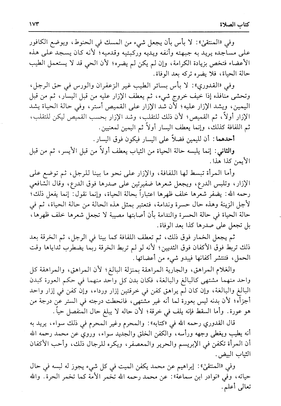 وفي «القدوري» : لا بأس بسائر الطيب غير الزعفران والورس في حق الرجل، وتحشى منافذه إذا خيف خروج شيء، ثم يعطف الإزار عليه من قبل اليسار، ثم من قبل اليمين، ويشد الإزار عليه؛ لأن شد الإزار على القميص أستر، وفي حالة الحياة يشد الإزار أولاً، ثم القميص؛ لأن ذلك للتقلب، وشد الإزار بحسب القميص ليكن للتقلب، ثم اللفافة كذلك، وإنما يعطف اليسار أولاً ثم اليمين لمعنيين.