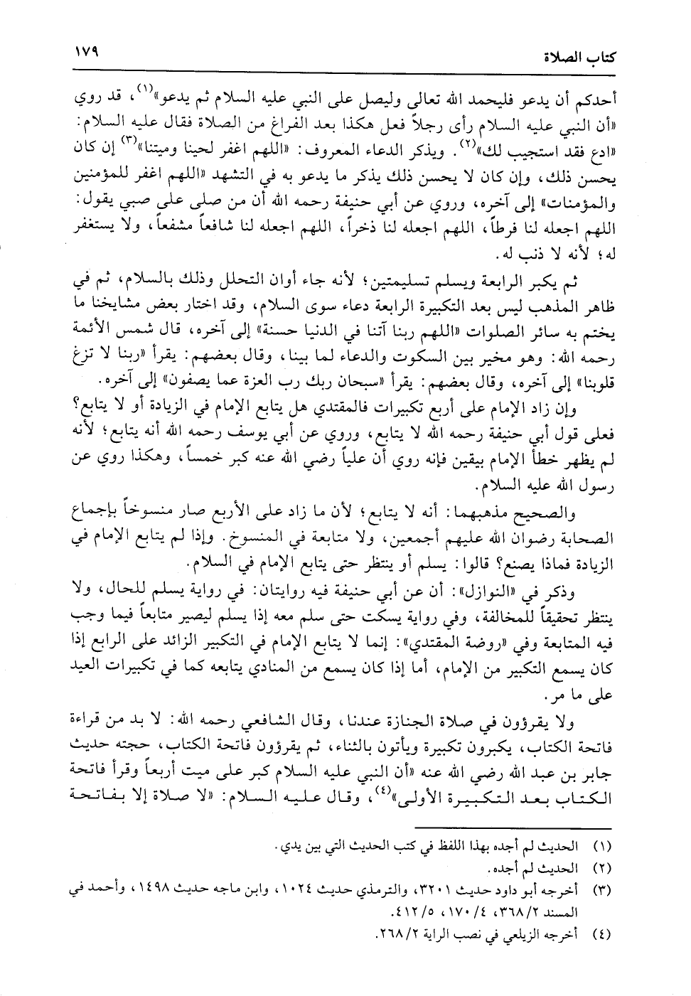ثم يكبر الرابعة ويسلم تسليمتين؛ لأنه جاء أوان التحلل وذلك بالسلام، ثم في ظاهر المذهب ليس بعد التكبيرة الرابعة دعاء سوى السلام، وقد اختار بعض مشايخنا ما يختم به سائر الصلوات «اللهم ربنا آتنا في الدنيا حسنة» إلى آخره، قال شمس الأئمة رحمه الله: وهو مخير بين السكوت والدعاء لما بينا، وقال بعضهم: يقرأ «ربنا لا تزغ قلوبنا» إلى آخره، وقال بعضهم: يقرأ «سبحان ربك رب العزة عما يصفون» إلى آخره.