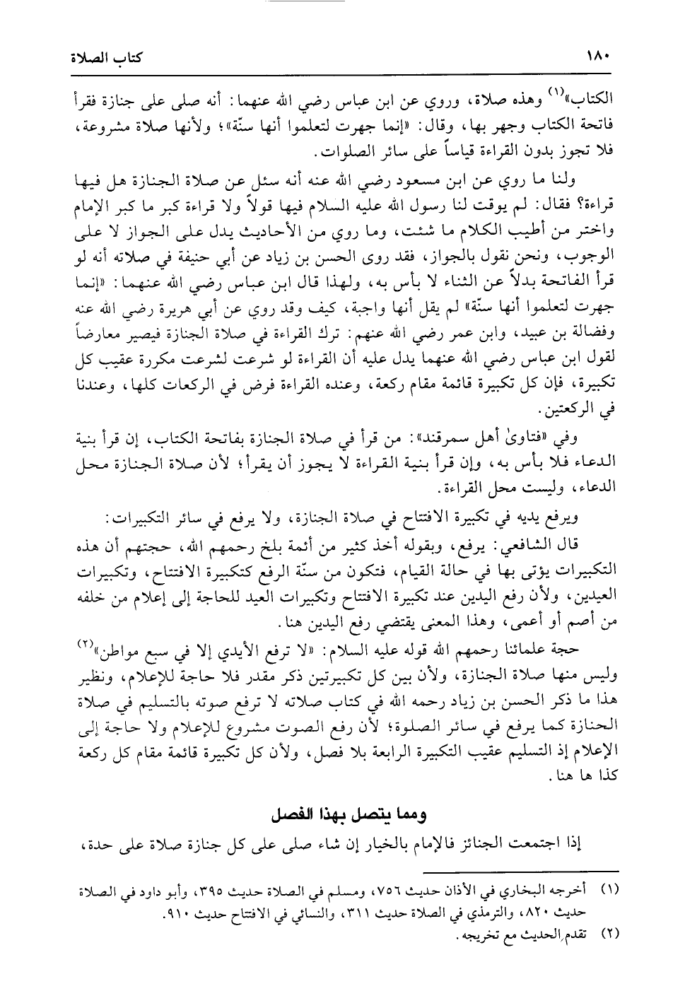 ولنا ما روي عن ابن مسعود رضي الله عنه أنه سئل عن صلاة الجنازة هل فيها قراءة؟ فقال: لم يوقت لنا رسول الله عليه السلام فيها قولاً ولا قراءة كبر ما كبر الإمام واختر من أطيب الكلام ما شئت، وما روي من الأحاديث يدل على الجواز لا على الوجوب، ونحن نقول بالجواز، فقد روى الحسن بن زياد عن أبي حنيفة في صلاته أنه لو قرأ الفاتحة بدلاً عن الثناء لا بأس به، ولهذا قال ابن عباس رضي الله عنهما: «إنما جهرت لتعلموا أنها سنّة» لم يقل أنها واجبة، كيف وقد روي عن أبي هريرة رضي الله عنه وفضالة بن عبيد، وابن عمر رضي الله عنهم: ترك القراءة في صلاة الجنازة فيصير معارضاً لقول ابن عباس رضي الله عنهما يدل عليه أن القراءة لو شرعت لشرعت مكررة عقيب كل تكبيرة، فإن كل تكبيرة قائمة مقام ركعة، وعنده القراءة فرض في الركعات كلها، وعندنا في الركعتين.