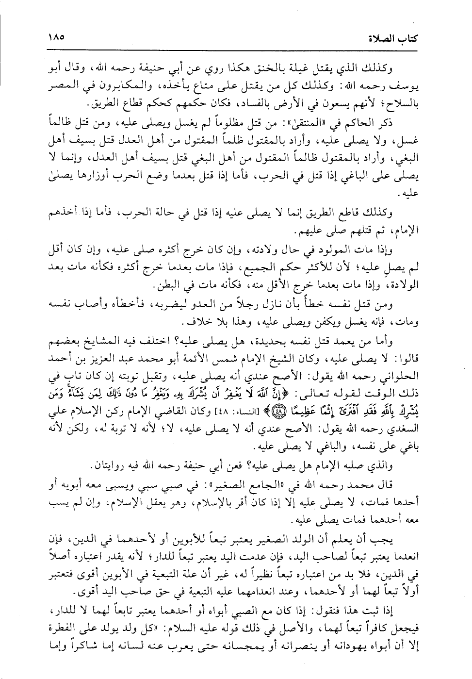 وأما من يعمد قتل نفسه بحديدة، هل يصلى عليه؟ اختلف فيه المشايخ بعضهم قالوا: لا يصلى عليه، وكان الشيخ الإمام شمس الأئمة أبو محمد عبد العزيز بن أحمد الحلواني رحمه الله يقول: الأصح عندي أنه يصلى عليه، وتقبل توبته إن كان تاب في ذلك الوقت لقوله تعالى: {إِنَّ اللَّهَ لاَ يَغْفِرُ أَن يُشْرَكَ بِهِ وَيَغْفِرُ مَا دُونَ ذَلِكَ لِمَن يَشَآء وَمَن يُشْرِكْ بِاللَّهِ فَقَدِ افْتَرَى إِثْماً عَظِيماً} (النساء: 48) وكان القاضي الإمام ركن الإسلام علي السغدي رحمه الله يقول: الأصح عندي أنه لا يصلى عليه، لا؛ لأنه لا توبة له، ولكن لأنه باغي على نفسه، والباغي لا يصلى عليه.