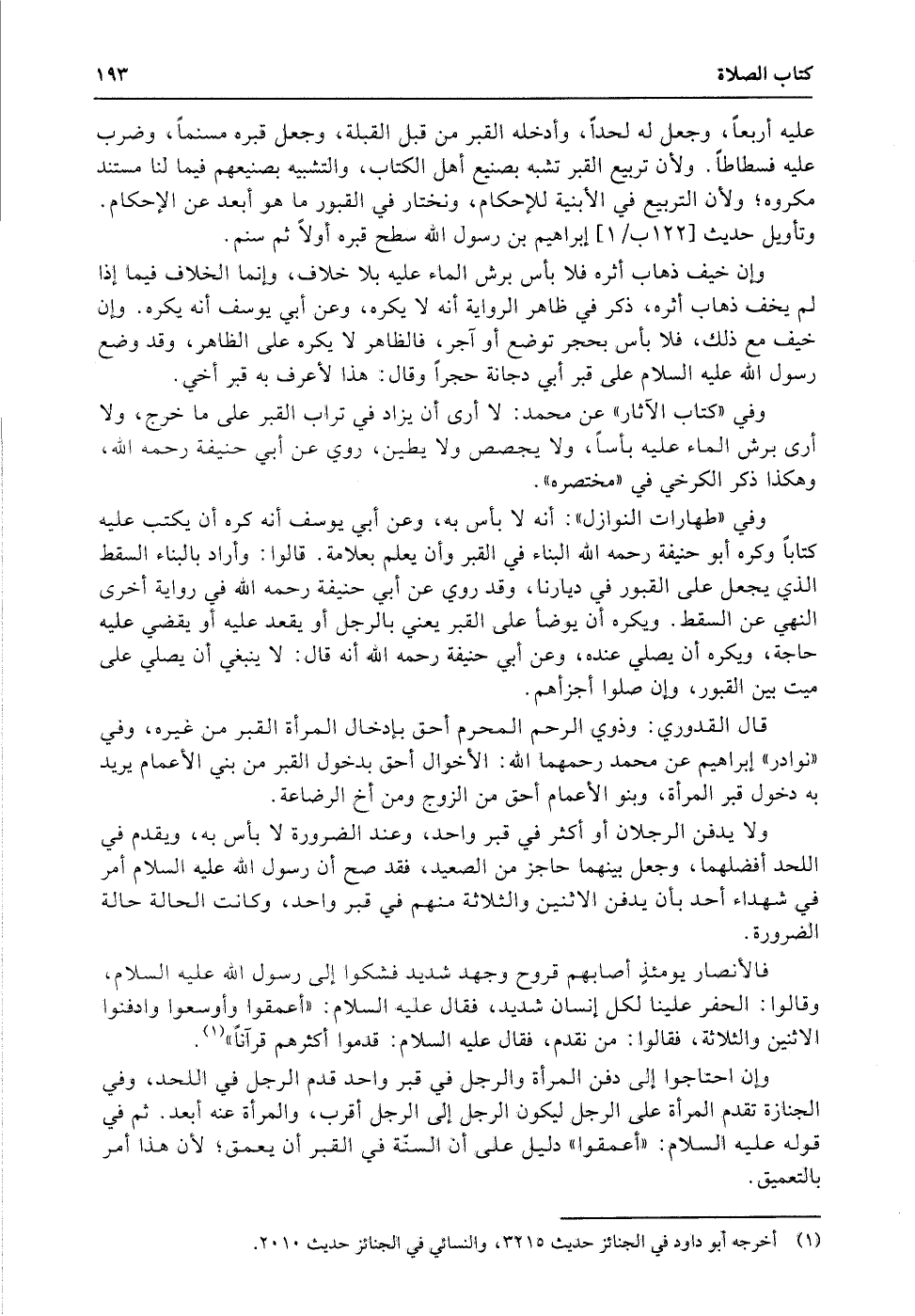 ولا يدفن الرجلان أو أكثر في قبر واحد، وعند الضرورة لا بأس به، ويقدم في اللحد أفضلهما، وجعل بينهما حاجز من الصعيد، فقد صح أن رسول الله عليه السلام أمر في شهداء أحد بأن يدفن الاثنين والثلاثة منهم في قبر واحد، وكانت الحالة حالة الضرورة.