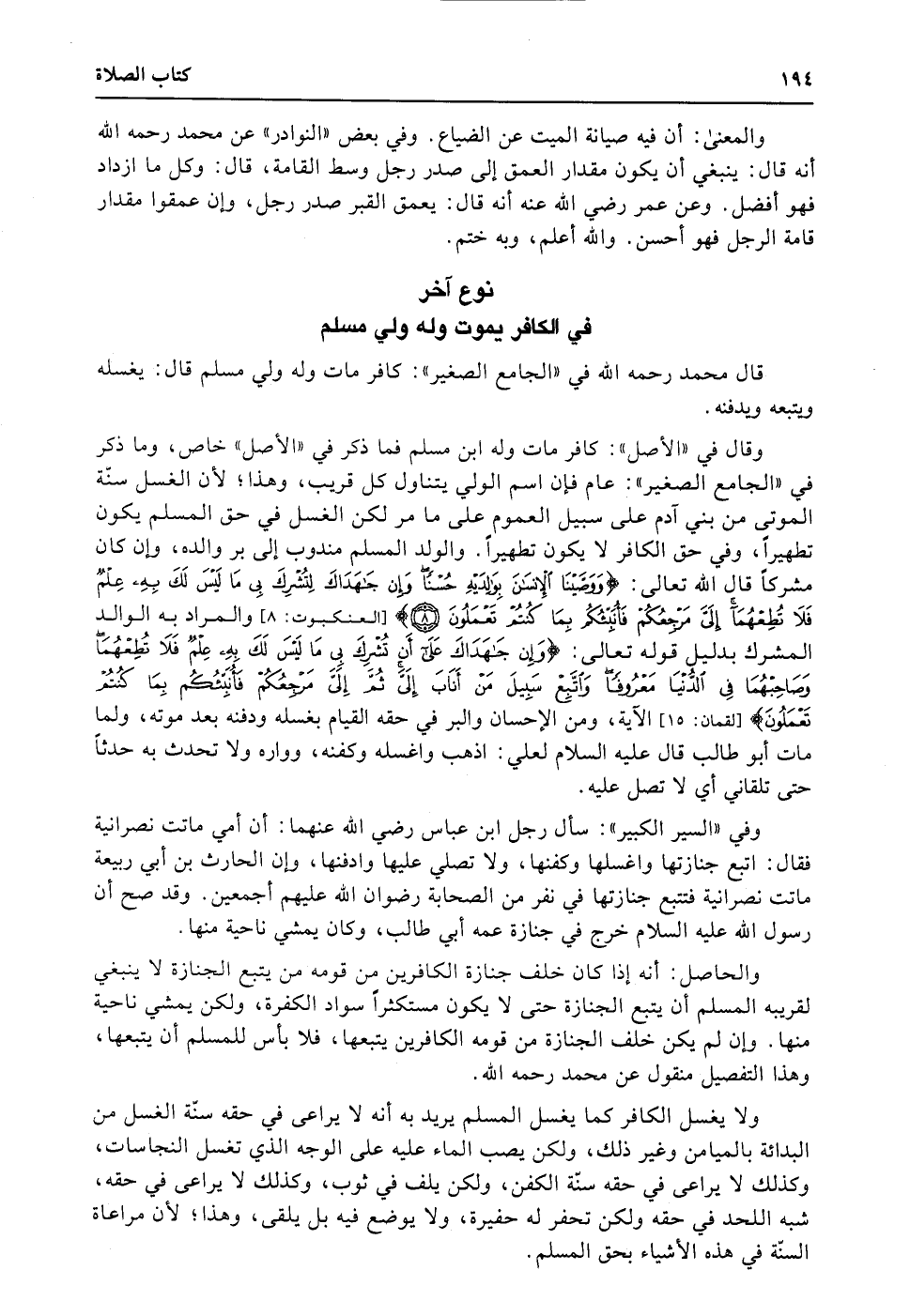 وفي «السير الكبير» : سأل رجل ابن عباس رضي الله عنهما: أن أمي ماتت نصرانية فقال: اتبع جنازتها واغسلها وكفنها، ولا تصلي عليها وادفنها، وإن الحارث بن أبي ربيعة ماتت نصرانية فتتبع جنازتها في نفر من الصحابة رضوان الله عليهم أجمعين. وقد صح أن رسول الله عليه السلام خرج في جنازة عمه أبو طالب، وكان يمشي ناحية منها.