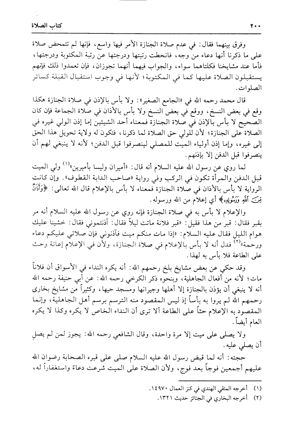 والإعلام لا بأس به في صلاة الجنازة فإنه روي عن رسول الله عليه السلام أنه مر بقبر فقال: قبر من هذا فقيل: «قبر فلانة ماتت ليلاً فقال: آذنتموني فقال: خشينا عليك هوام الليل فقال عليه السلام: «إذا مات منكم ميت فآذنوني فإن صلاتي عليكم دعاء ورحمة» فدل أنه لا بأس بالإعلام في صلاة الجنازة، ولأن في الإعلام إعانة وحث على الطاعة فلا بأس به لهذا.