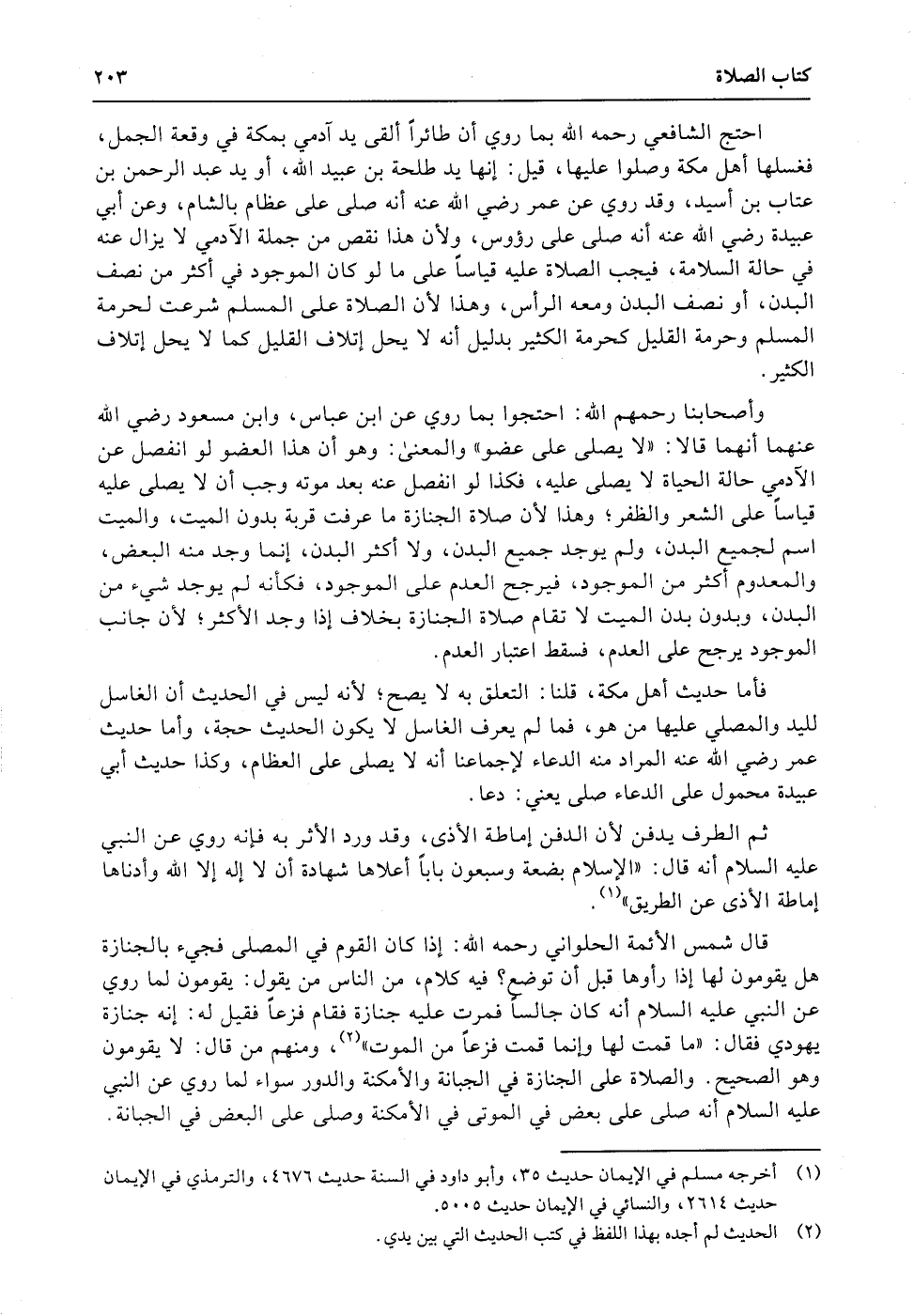 فأما حديث أهل مكة، قلنا: التعلق به لا يصح؛ لأنه ليس في الحديث أن الغاسل لليد والمصلي عليها من هو، فما لم يعرف الغاسل لا يكون الحديث حجة، وأما حديث عمر رضي الله عنه المراد منه الدعاء لإجماعنا أنه لا يصلى على العظام، وكذا حديث أبي عبيدة محمول على الدعاء صلى يعني: دعا.