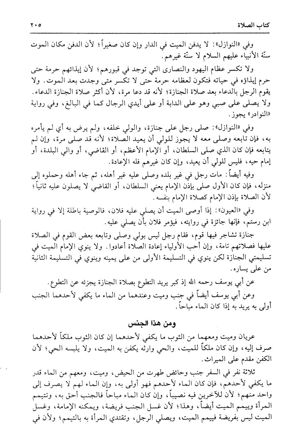 ولا تكسر عظام اليهود والنصارى التي توجد في قبورهم؛ لأن إيذائهم حرمة حتى حرم إيذاؤه في حياته فتكون لعظامه حرمة حتى لا تكسر متى وجدت بعد الموت. ولا يقوم الرجل بالدعاء بعد صلاة الجنازة؛ لأنه قد دعا مرة، لأن أكثر صلاة الجنازة الدعاء. ولا يصلى على صبي وهو على الدابة أو على أيدي الرجال كما في البالغ، وفي رواية «النوادر» يجوز.