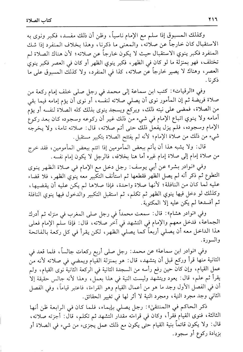 وفي «الرقيات» : كتب ابن سماعة إلى محمد في رجل صلى خلف إمام ركعة من صلاة فريضة (ثم) أن المأمور نوى أن يصلي صلاته لنفسه، أو نوى أن يؤم إمامه فيما بقي من الصلاة، فمضى على نيته ذلك، ويركع ويسجد ينوى بذلك كله الصلاة لنفسه أو يؤم أمامه ولا ينوي اتباع الإمام في شيء من ذلك غير أن ركوعه وسجوده كان بعد ركوع الإمام وسجوده، فلم يزل يفعل ذلك حتى أتم صلاته، قال: صلاته تامة، ولا يخرجه شيء من ذلك من صلاة الإمام؛ لأنه لم يفتتح الصلاة بتكبير مستقبل.