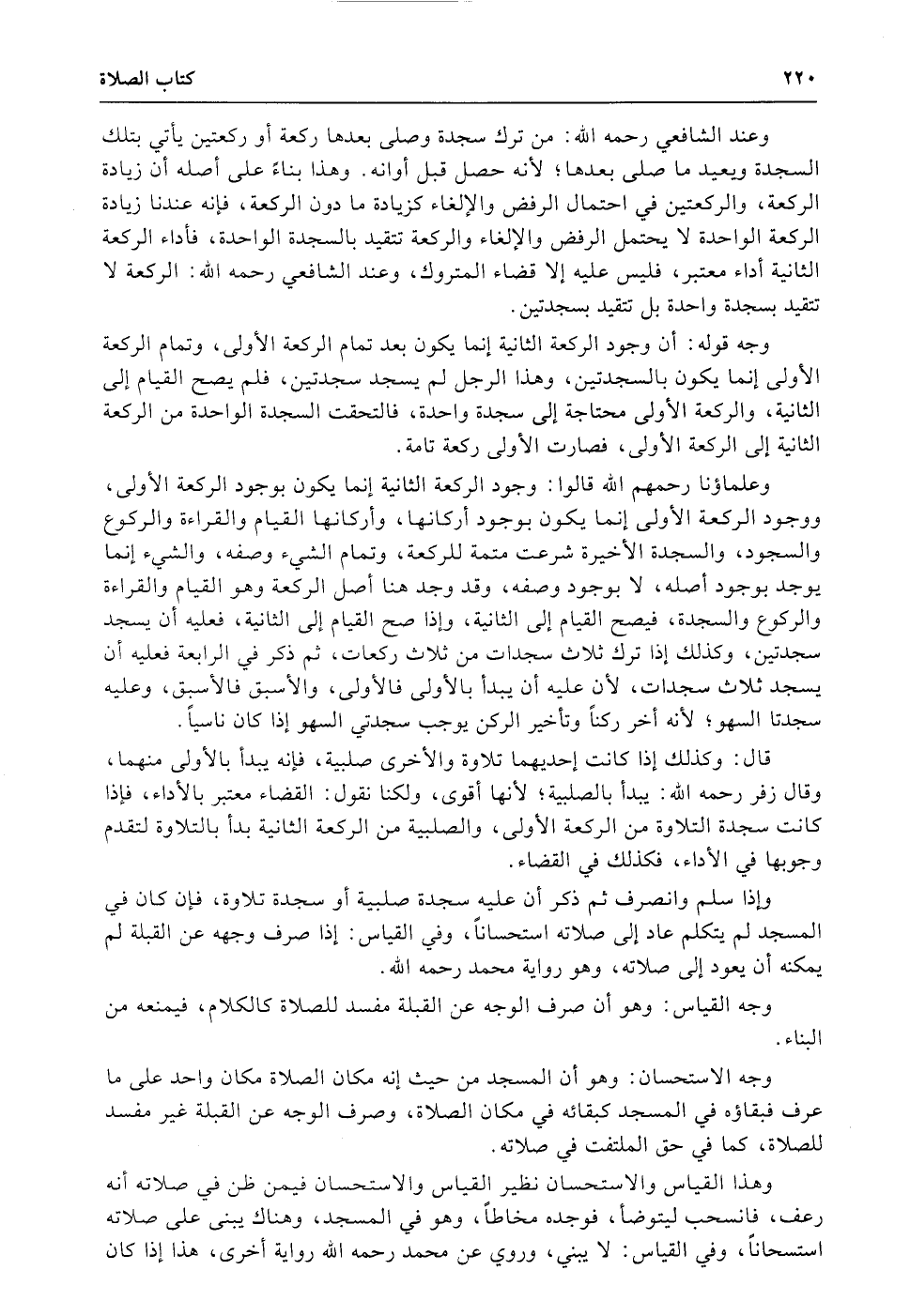 وإذا سلم وانصرف ثم ذكر أن عليه سجدة صلبية أو سجدة تلاوة، فإن كان في المسجد لم يتكلم عاد إلى صلاته استحساناً، وفي القياس: إذا صرف وجهه عن القبلة لم يمكنه أن يعود إلى صلاته، وهو رواية محمد رحمه الله.