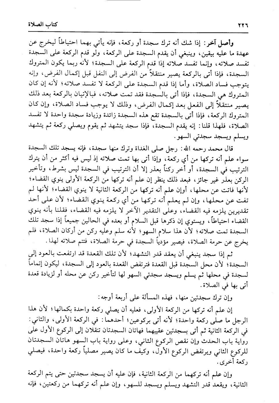وأصل آخر: إذا شك أنه ترك سجدة أو ركعة، فإنه يأتي بهما احتياطاً ليخرج عن عهدة ما عليه بيقين، وينبغي أن يقدم السجدة على الركعة، ولو قدم الركعة على السجدة تفسد صلاته، وإنما تفسد صلاته إذا قدم الركعة على السجدة؛ لأنه ربما يكون المتروك السجدة، فإذا أتى بالركعة يصير منتقلاً من الفرض إلى النفل قبل إكمال الفرض، وإنه يتوجب فساد الصلاة، وأما إذا قدم السجدة على الركعة لا تفسد صلاته؛ لأنه إن كان المتروك هي السجدة، فإذا أتى بالسجدة فقد تمت صلاته، فبالإتيان بالركعة بعد ذلك يصير منتقلاً إلى الفعل بعد إكمال الفرض، وذلك لا يوجب فساد الصلاة، وإن كان المتروك الركعة، فإذا أتى بالسجدة تقع هذه السجدة زائدة وزيادة سجدة واحدة لا تفسد الصلاة، فلهذا قلنا: إنه يقدم السجدة، فإذا سجد يتشهد ثم يقوم ويصلي ركعة ثم يتشهد ويسلم ويسجد سجدتي السهو.