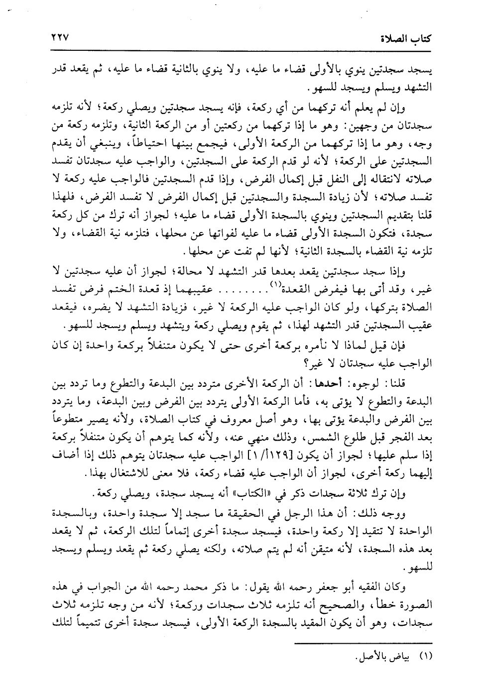 وكان الفقيه أبو جعفر رحمه الله يقول: ما ذكر محمد رحمه الله من الجواب في هذه الصورة خطأ، والصحيح أنه تلزمه ثلاث سجدات وركعة؛ لأنه من وجه تلزمه ثلاث سجدات، وهو أن يكون المقيد بالسجدة الركعة الأولى، فيسجد سجدة أخرى تتميماً لتلك