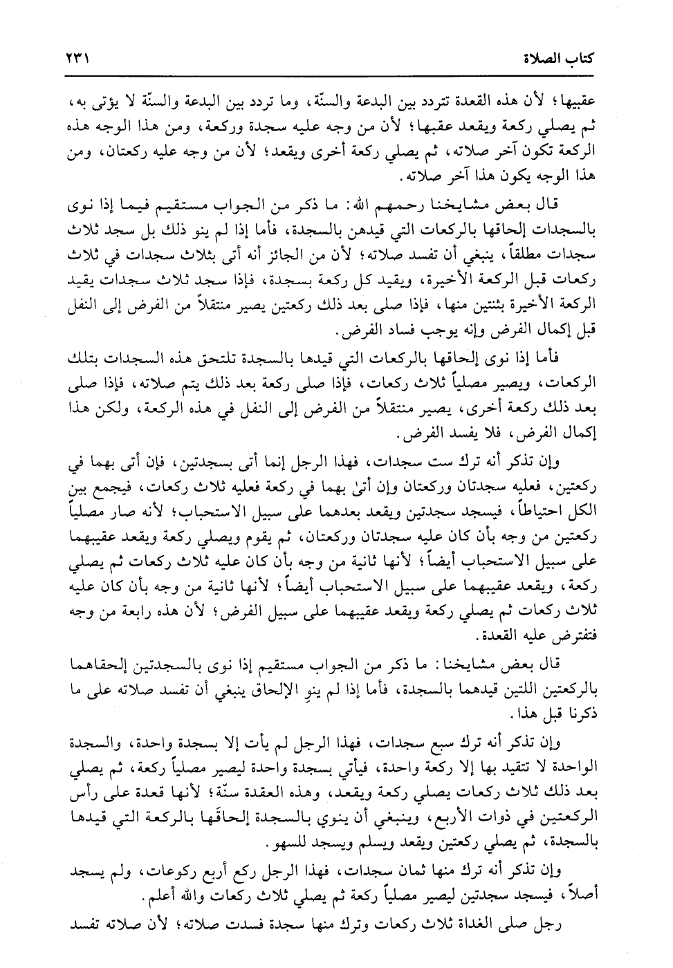 قال بعض مشايخنا رحمهم الله: ما ذكر من الجواب مستقيم فيما إذا نوى بالسجدات إلحاقها بالركعات التي قيدهن بالسجدة، فأما إذا لم ينو ذلك بل سجد ثلاث سجدات مطلقاً، ينبغي أن تفسد صلاته؛ لأن من الجائز أنه أتى بثلاث سجدات في ثلاث ركعات قبل الركعة الأخيرة، ويقيد كل ركعة بسجدة، فإذا سجد ثلاث سجدات يقيد الركعة الأخيرة بثنتين منها، فإذا صلى بعد ذلك ركعتين يصير منتقلاً من الفرض إلى النفل قبل إكمال الفرض وإنه يوجب فساد الفرض.