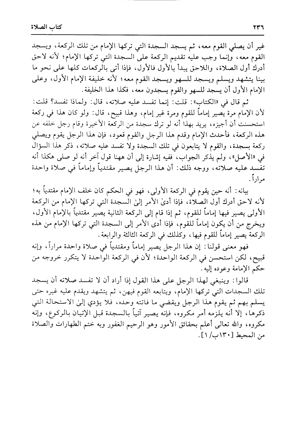 قالوا: وينبغي لهذا الرجل على هذا القول إذا أراد أن لا تفسد صلاته أن يسجد تلك السجدات التي تركها الإمام، ويتابعه القوم فيهن، ثم يتشهد ويقدم عليه غيره حتى يسلم بهم ثم يقوم هذا الرجل ويقضي ما فاتته وحده، فلا يؤدي إلى الاستحالة التي ذكرها، إلا أنه يلزمه أمر مكروه، فإنه يصير آتياً بالسجدة قبل الإتيان بالركوع، وإنه مكروه، والله تعالى أعلم بحقائق الأمور وهو الرحيم الغفور وبه ختم الطهارات والصلاة من المحيط (130ب1) .