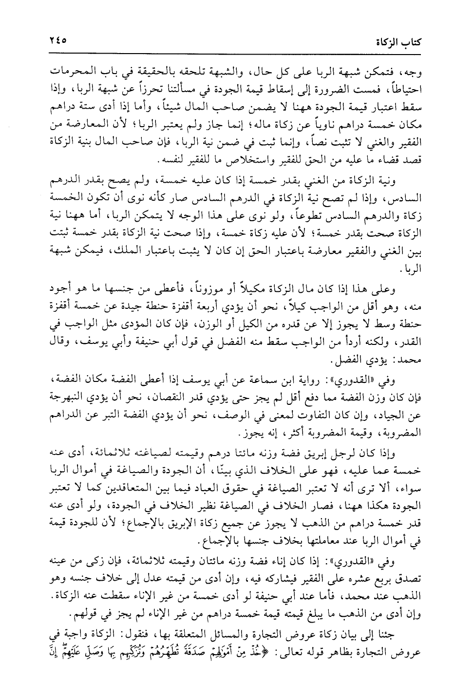 وأبو حنيفة وأبو يوسف قالا: إن الربا فيما بين الفقير والغني ممكن من وجه دون وجه، فتمكن شبهة الربا على كل حال، والشبهة تلحقه بالحقيقة في باب المحرمات احتياطاً، فمست الضرورة إلى إسقاط قيمة الجودة في مسألتنا تحرزاً عن شبهة الربا، وإذا سقط اعتبار قيمة الجودة ههنا لا يضمن صاحب المال شيئاً، وأما إذا أدى ستة دراهم مكان خمسة دراهم ناوياً عن زكاة ماله؛ إنما جاز ولم يعتبر الربا؛ لأن المعارضة من الفقير والغني لا تثبت نصاً، وإنما ثبت في ضمن نية الربا، فإن صاحب المال بنية الزكاة قصد قضاء ما عليه من الحق للفقير واستخلاص ما للفقير لنفسه.