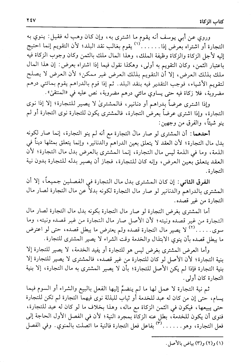 وإذا اشترى عرضاً بدراهم أو دنانير، فالمشترى لا يصير للتجارة؛ إلا إذا نوى التجارة، وإذا اشترى عرضاً بعرض التجارة، فالمشترى يكون للتجارة نوى التجارة أو لم ينو شيئاً، والفرق من وجهين: