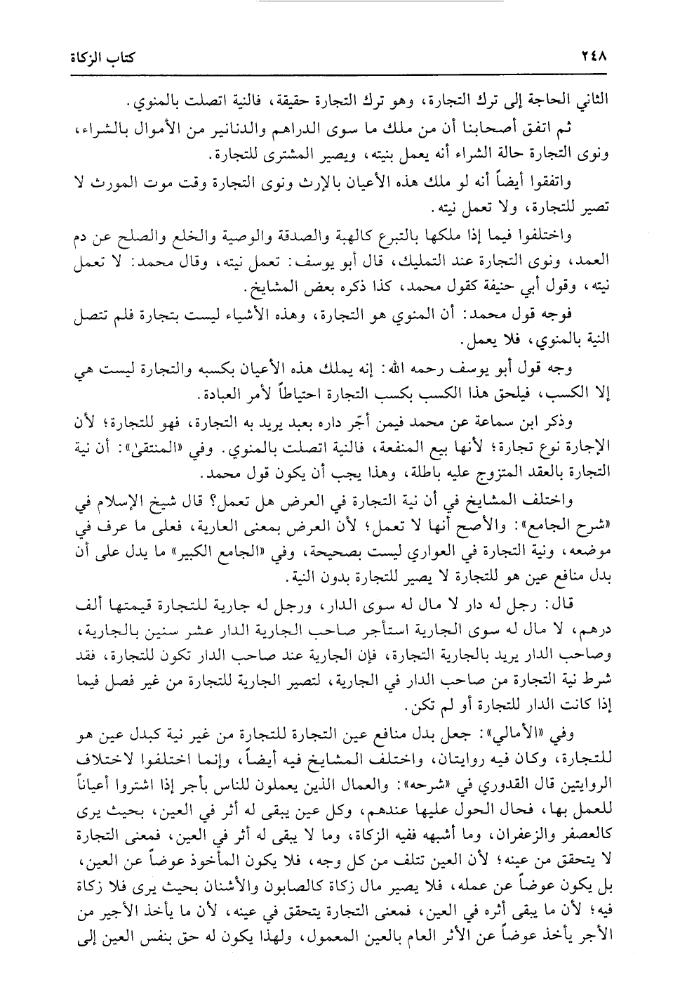 واختلف المشايخ في أن نية التجارة في العرض هل تعمل؟ قال شيخ الإسلام في «شرح الجامع» : والأصح أنها لا تعمل؛ لأن العرض بمعنى العارية، فعلى ما عرف في موضعه، ونية التجارة في العواري ليست بصحيحة، وفي «الجامع الكبير» ما يدل على أن بدل منافع عين هو للتجارة لا يصير للتجارة بدون النية.