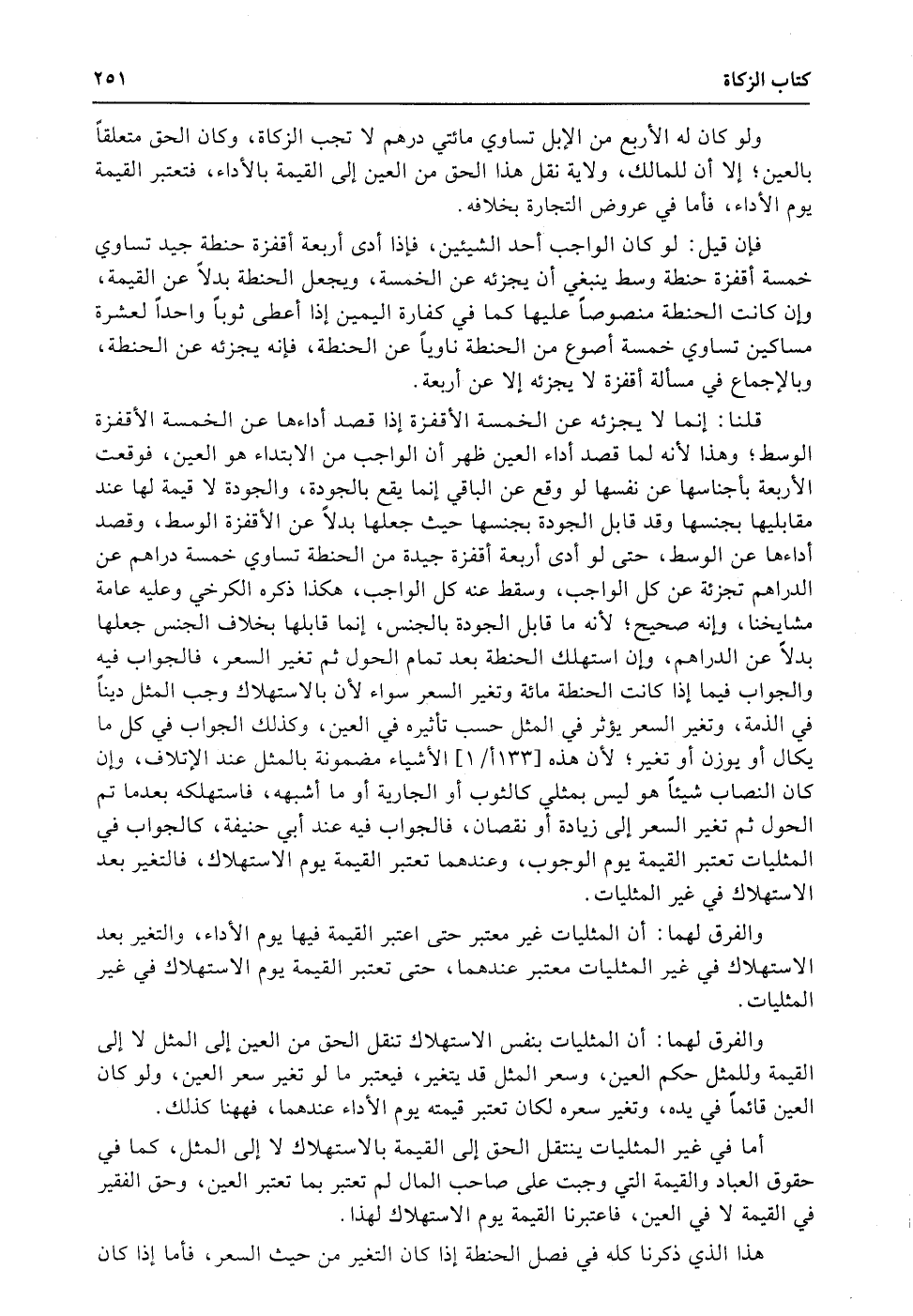 أما في غير المثليات ينتقل الحق إلى القيمة بالاستهلاك لا إلى المثل، كما في حقوق العباد والقيمة التي وجبت على صاحب المال لم تعتبر بما تعتبر العين، وحق الفقير في القيمة لا في العين، فاعتبرنا القيمة يوم الاستهلاك لهذا.