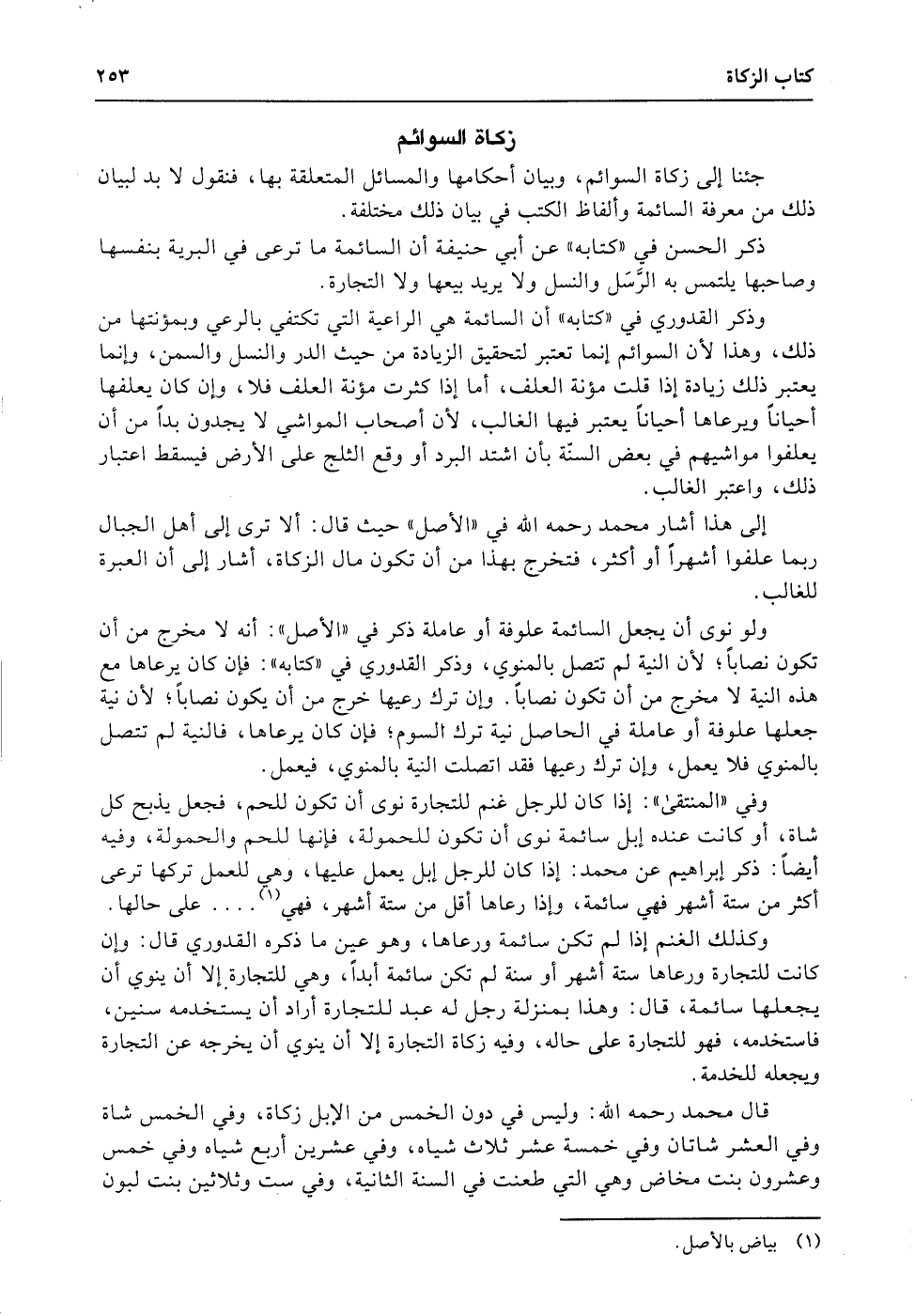 وذكر القدوري في «كتابه» أن السائمة هي الراعية التي تكتفي بالرعي وبمؤنتها (من) ذلك، وهذا لأن السوائم إنما تعتبر لتحقيق الزيادة من حيث الدر والنسل والسمن، وإنما يعتبر ذلك زيادة إذا قلت مؤنة العلف، أما إذا كثرت مؤنة العلف فلا، وإن كان يعلفها أحياناً ويرعاها أحياناً يعتبر فيها الغالب، لأن أصحاب المواشي لا يجدون بداً من أن يعلفوا مواشيهم في بعض السنّة بأن اشتد البرد أو وقع الثلج على الأرض فيسقط اعتبار ذلك، واعتبر الغالب.