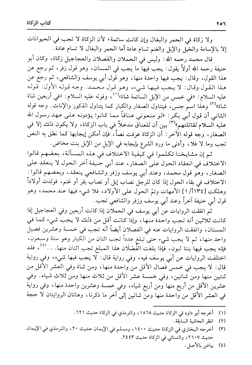 ثم اتفقت الروايات عن أبي يوسف في الحملان إذا كانت أربعين وفي العجاجيل إذا كانت ثلاثين أنه تجب واحدة منها، وإذا كانت أقل من ذلك لا يجب شيء كما في المسنان، واتفقت الروايات عنه في الفصلان أيضاً أنه تجب في خمسة وعشرين فصيل واحد منها، ثم لا يجب شيء حتى تبلغ عدداً تجب اثنان من الكبار وهو ستة وسبعون، فإنه يجب فيها بنتا لبون، فإذا بلغت الفُصْلان هذا المبلغ تجب اثنان منها.......، فقد اختلفت الروايات عن أبي يوسف فيه، وفي رواية قال: لا يجب فيها شيء، وفي رواية قال: لا يجب في خمس فصال الأقل من واحدة منها، ومن شاة وفي العشر الأقل من ثنتين منها ومن شاتين، وفي خمسة عشر الأقل من ثلاث منها ومن ثلاث شياه. وفي عشرين الأقل من أربع منها ومن أربع شياه، وفي خمسة وعشرين واحدة منها، وفي رواية في العشر الأقل من واحدة منها ومن شاتين إلى آخر ما ذكرنا، وهاتان الروايتان لا حجة
