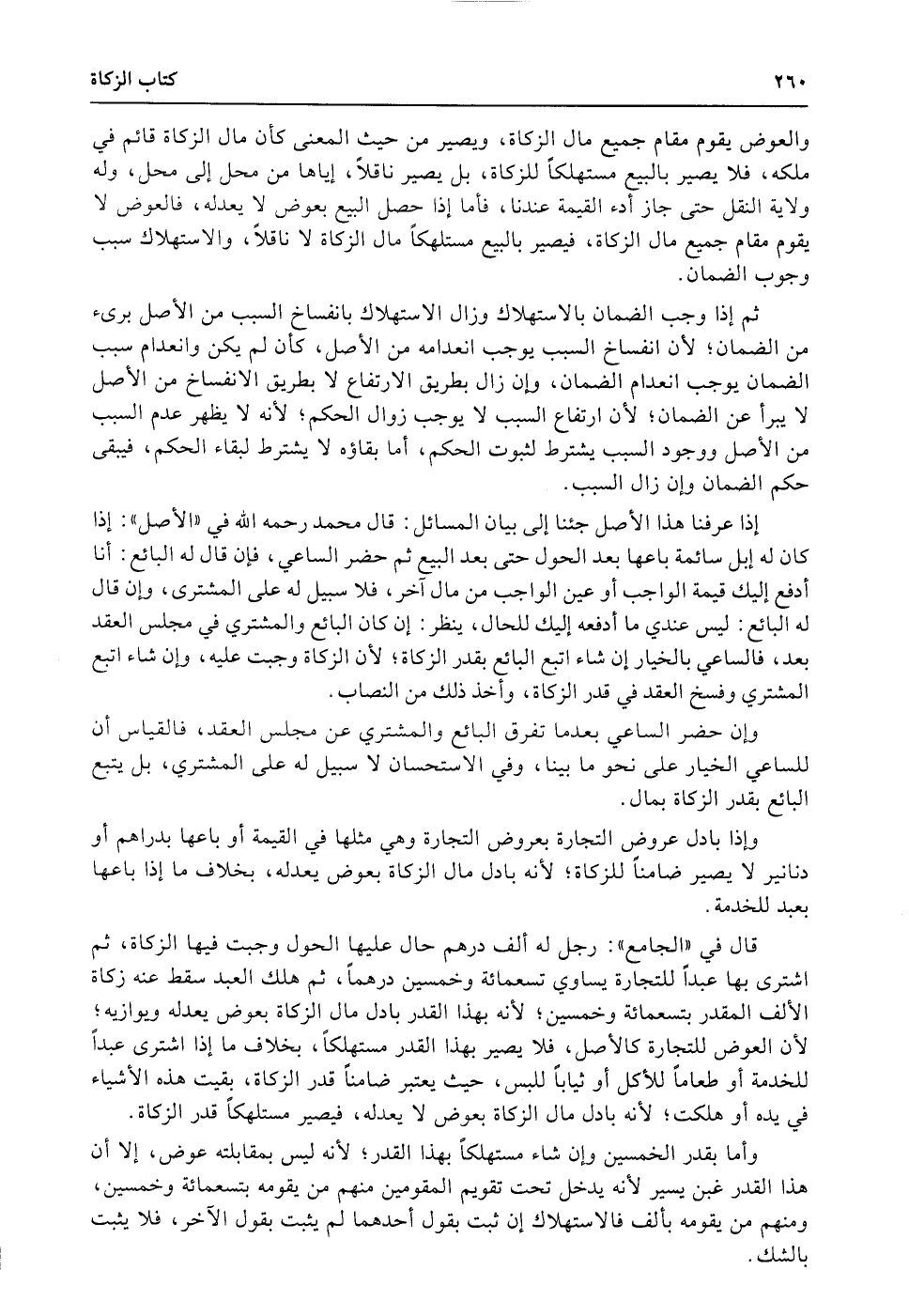 والعوض يقوم مقام جميع مال الزكاة، ويصير من حيث المعنى كأن مال الزكاة قائم في ملكه، فلا يصير بالبيع مستهلكاً للزكاة، بل يصير ناقلاً، إياها من محل إلى محل، وله ولاية النقل حتى جاز أدء القيمة عندنا، فأما إذا حصل البيع بعوض لا يعدله، فالعوض لا يقوم مقام جميع مال الزكاة، فيصير بالبيع مستلهكاً مال الزكاة لا ناقلاً، والاستهلاك سبب وجوب الضمان.