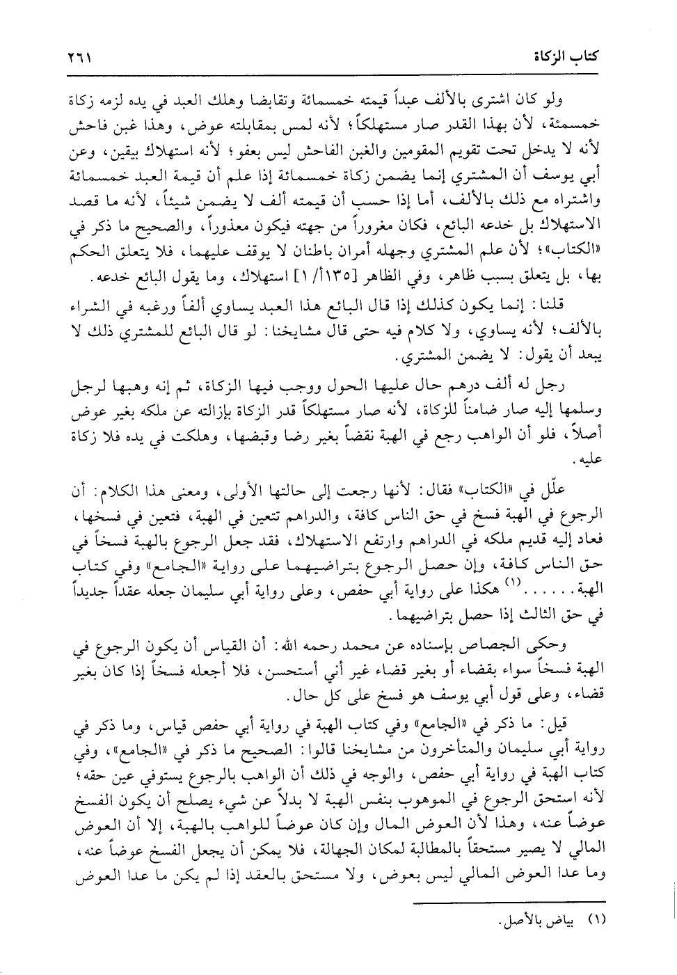علّل في «الكتاب» فقال: لأنها رجعت إلى حالتها الأولى، ومعنى هذا الكلام: أن الرجوع في الهبة فسخ في حق الناس كافة، والدراهم تتعين في الهبة، فتعين في فسخها، فعاد إليه قديم ملكه في الدراهم وارتفع الاستهلاك، فقد جعل الرجوع بالهبة فسخاً في حق الناس كافة، وإن حصل الرجوع بتراضيهما على رواية «الجامع» وفي كتاب الهبة........ هكذا على رواية أبي حفص، وعلى رواية أبي سليمان جعله عقداً جديداً في حق الثالث إذا حصل بتراضيهما.