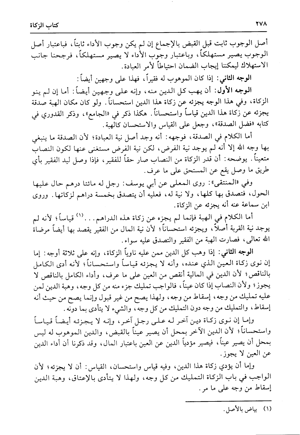 الوجه الأول: أن يهب كل الدين منه، وإنه على وجهين أيضاً: أما إن لم ينو الزكاة، وفي هذا الوجه يجزئه عن زكاة هذا الدين استحساناً. ولو كان مكان الهبة صدقة يجزئه عن زكاة هذا الدين قياساً واستحساناً. هكذا ذكر في «الجامع» ، وذكر القدوري في كتابه «فضل الصدقة» ، وجعل على القياس والاستحسان كالهبة.