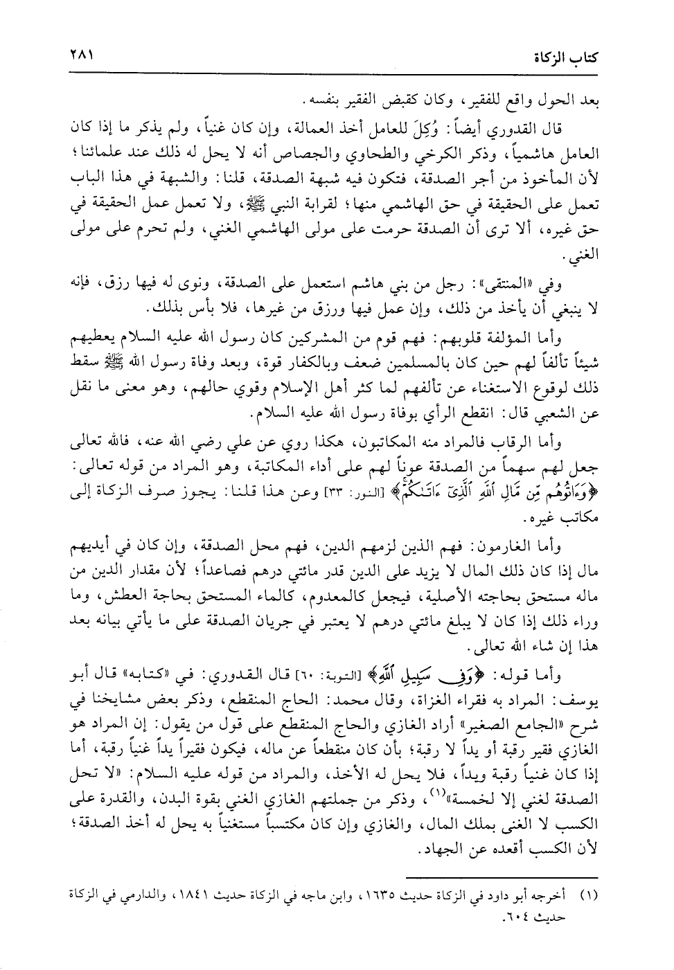 وأما قوله: {وفي سبيل ا} (التوبة: 60) قال القدوري: في «كتابه» قال أبو يوسف: المراد به فقراء الغزاة، وقال محمد: الحاج المنقطع، وذكر بعض مشايخنا في شرح «الجامع الصغير» أراد الغازي والحاج المنقطع على قول من يقول: إن المراد هو الغازي فقير رقبة أو يداً لا رقبة؛ بأن كان منقطعاً عن ماله، فيكون فقيراً يداً غنياً رقبة، أما إذا كان غنياً رقبة ويداً، فلا يحل له الأخذ، والمراد من قوله عليه السلام: «لا تحل الصدقة لغني إلا لخمسة» ، وذكر من جملتهم الغازي الغني بقوة البدن، والقدرة على الكسب لا الغنى بملك المال، والغازي وإن كان مكتسباً مستغنياً به يحل له أخذ الصدقة؛ لأن الكسب أقعده عن الجهاد.