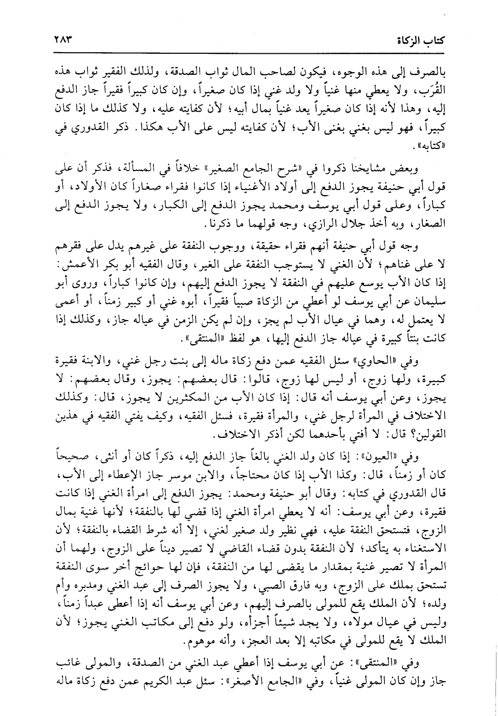 وفي «العيون» : إذا كان ولد الغني بالغاً جاز الدفع إليه، ذكراً كان أو أنثى، صحيحاً كان أو زمناً، قال: وكذا الأب إذا كان محتاجاً، والابن موسر جاز الإعطاء إلى الأب، قال القدوري في كتابه: وقال أبو حنيفة ومحمد: يجوز الدفع إلى امرأة الغني إذا كانت فقيرة، وعن أبي يوسف: أنه لا يعطي امرأة الغني إذا قضي لها بالنفقة؛ لأنها غنية بمال الزوج، فتستحق النفقة عليه، فهي نظير ولد صغير لغني، إلا أنه شرط القضاء بالنفقة؛ لأن الاستغناء به يتأكد؛ لأن النفقة بدون قضاء القاضي لا تصير ديناً على الزوج، ولهما أن المرأة لا تصير غنية بمقدار ما يقضى لها من النفقة، فإن لها حوائج أخر سوى النفقة تستحق بملك على الزوج، وبه فارق الصبي، ولا يجوز الصرف إلى عبد الغني ومدبره وأم ولده؛ لأن الملك يقع للمولى بالصرف إليهم، وعن أبي يوسف أنه إذا أعطى عبداً زمناً، وليس في عيال مولاه، ولا يجد شيئاً أجزأه، ولو دفع إلى مكاتب الغني يجوز؛ لأن الملك لا يقع للمولى في مكاتبه إلا بعد العجز، وأنه موهوم.
