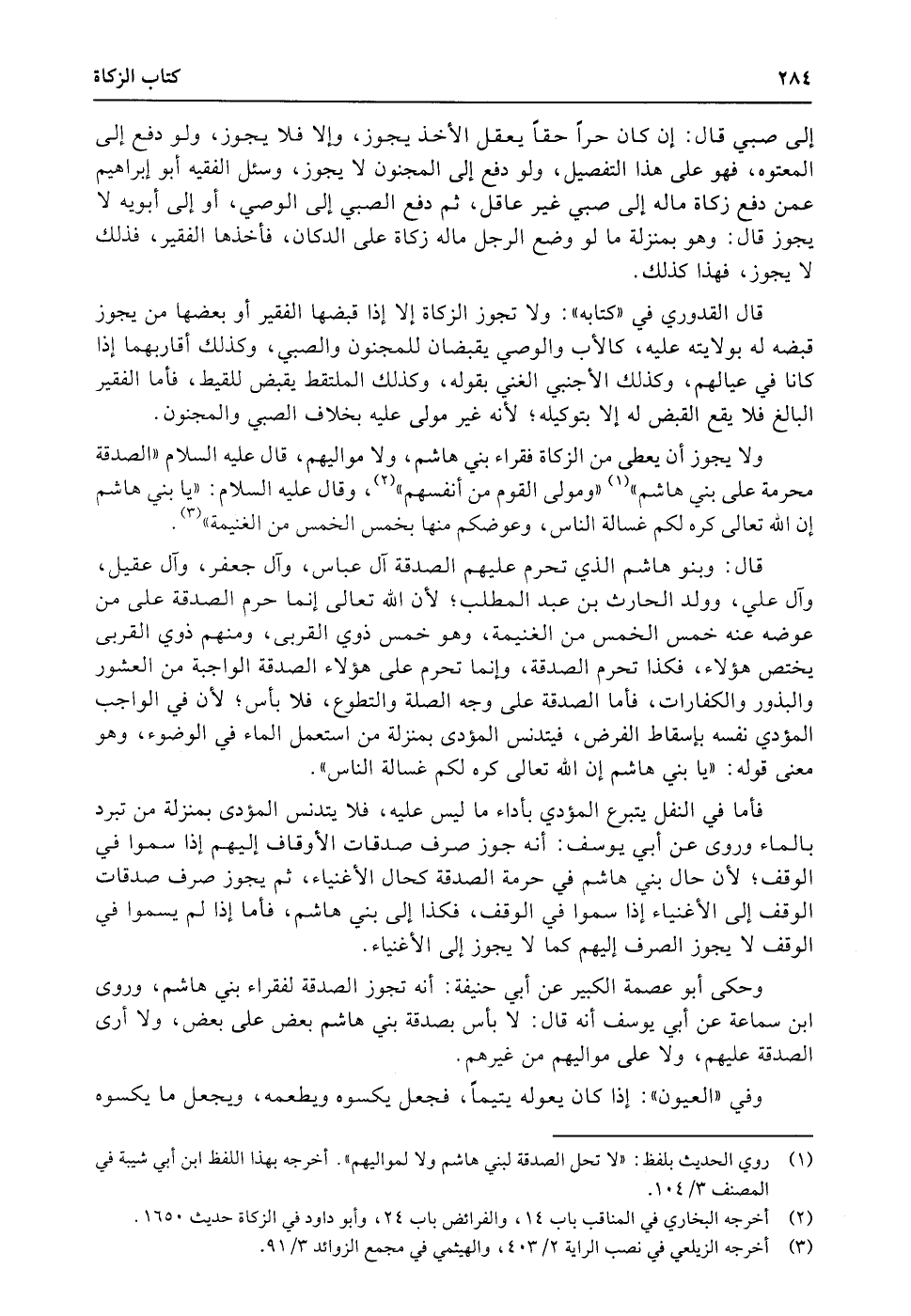 ولا يجوز أن يعطى من الزكاة فقراء بني هاشم، ولا مواليهم، قال عليه السلام «الصدقة محرمة على بني هاشم» ومولى القوم من أنفسهم، وقال عليه السلام: «يا بني هاشم إن الله تعالى كره لكم غسالة الناس، وعوضكم منها بخمس الخمس من الغنيمة» .