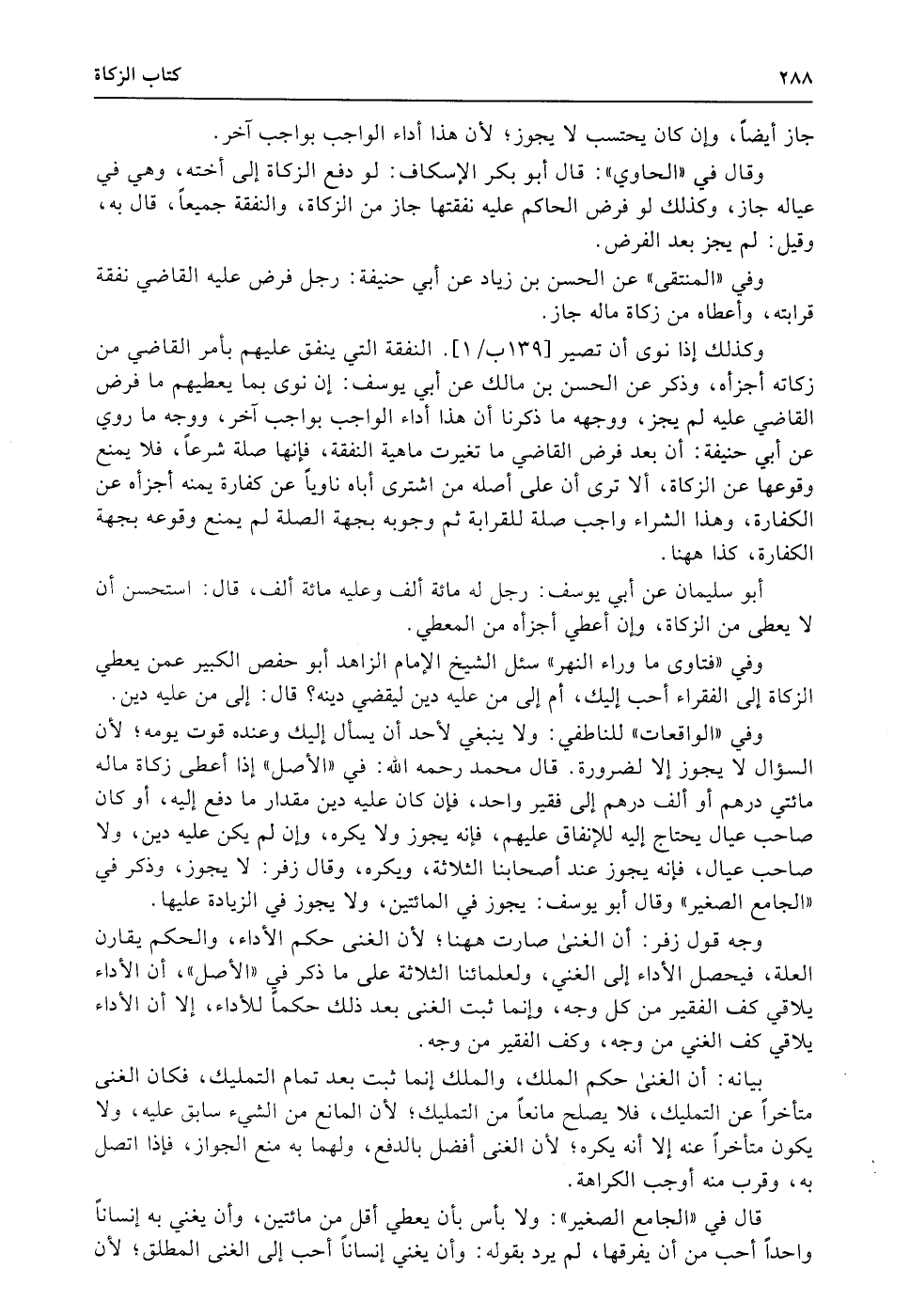 وفي «الواقعات» للناطفي: ولا ينبغي لأحد أن يسأل إليك وعنده قوت يومه؛ لأن السؤال لا يجوز إلا لضرورة. قال محمد رحمه الله: في «الأصل» إذا أعطى زكاة ماله مائتي درهم أو ألف درهم إلى فقير واحد، فإن كان عليه دين مقدار ما دفع إليه، أو كان صاحب عيال يحتاج إليه للإنفاق عليهم، فإنه يجوز ولا يكره، وإن لم يكن عليه دين، ولا صاحب عيال، فإنه يجوز عند أصحابنا الثلاثة، ويكره، وقال زفر: لا يجوز، وذكر في «الجامع الصغير» وقال أبو يوسف: يجوز في المائتين، ولا يجوز في الزيادة عليها.