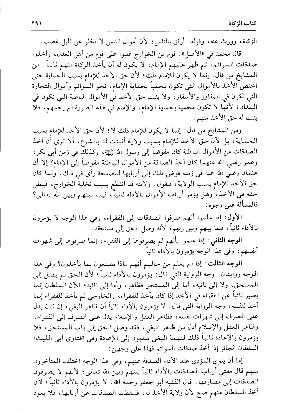 الوجه الثالث: إذا لم يعلم من حالهم أنهم ماذا يصنعون بما يأخذون؟ وفي هذا الوجه روايتان: وجه الرواية التي قال: يؤمرون بالأداء ثانياً؛ لأن الحق لم يصل إلى المستحق، ولا إلى نائبه، أما إلى المستحق فظاهر، وأما إلى نائبه؛ فلأن السلطان إنما يصير نائباً عن الفقراء في الأخذ إذا كان يأخذ للفقراء، والخارجي لم يأخذ للفقراء إنما أخذ لنفسه، وجه الرواية التي قال: لا يؤمرون بالأداء ثانياً أن ظاهر البغي، إن كان يدل على الصرف إلى شهوات نفسه، فظاهر العقل والإسلام يدل على الصرف إلى الفقراء، وظاهر العقل والإسلام أدل من ظاهر البغي، فقد وصل الحق إلى باب المستحق، فلا يؤمرون بالإعادة ثانياً ذلك لتهمة البغي يندبون إلى الإعادة وفي «فتاوى أبي الليث» السلطان الجائر إذا أخذ صدقات السوائم فهذا على وجهين: