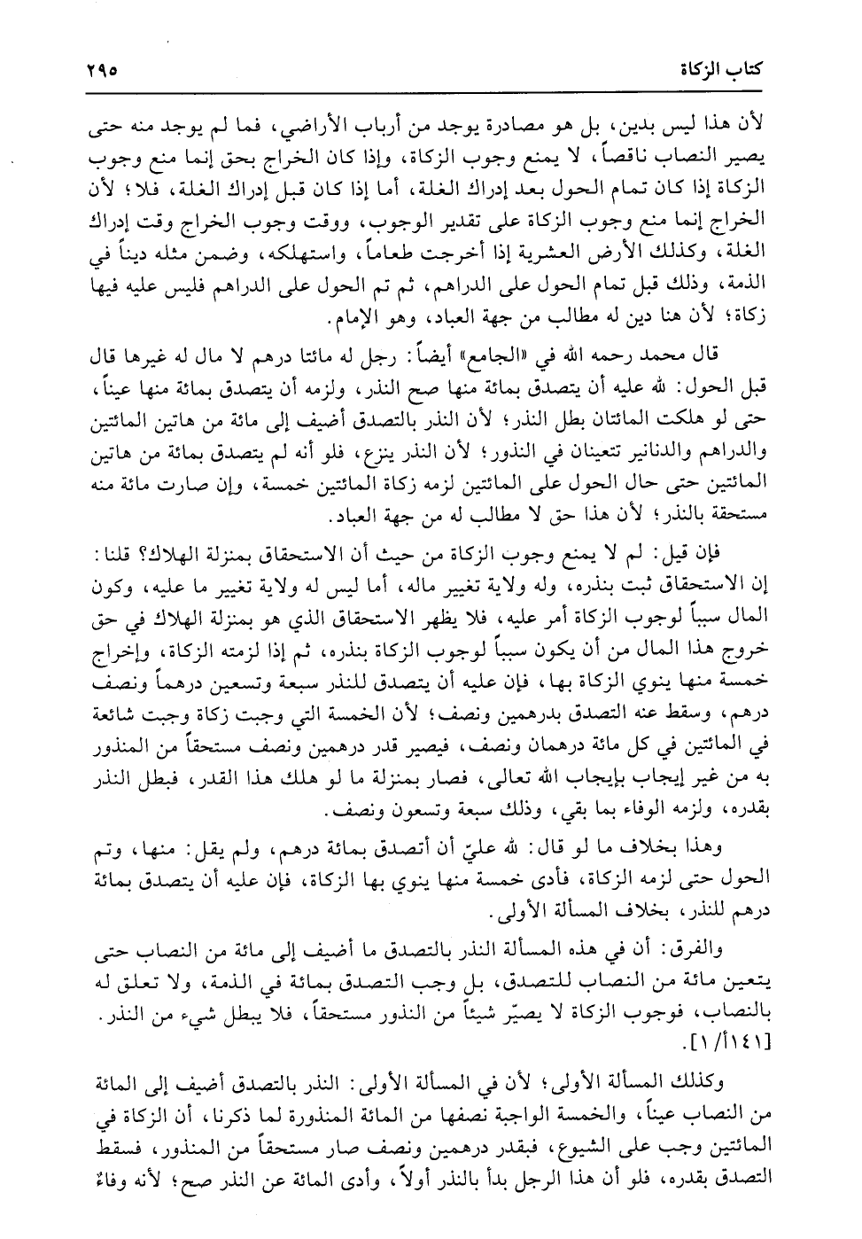 والفرق: أن في هذه المسألة النذر بالتصدق ما أضيف إلى مائة من النصاب حتى يتعين مائة من النصاب للتصدق، بل وجب التصدق بمائة في الذمة، ولا تعلق له بالنصاب، فوجوب الزكاة لا يصيّر شيئاً من النذور مستحقاً، فلا يبطل شيء من النذر. (141أ1)