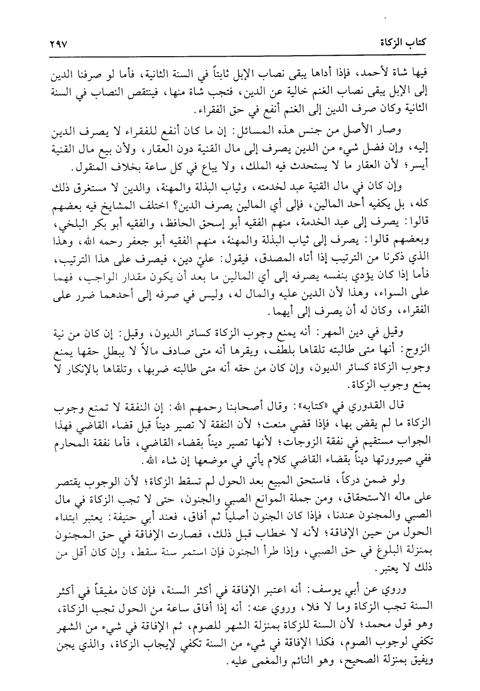 قال القدوري في «كتابه» : وقال أصحابنا رحمهم الله: إن النفقة لا تمنع وجوب الزكاة ما لم يقض بها، فإذا قضي منعت؛ لأن النفقة لا تصير ديناً قبل قضاء القاضي فهذا الجواب مستقيم في نفقة الزوجات؛ لأنها تصير ديناً بقضاء القاضي، فأما نفقة المحارم ففي صيرورتها ديناً بقضاء القاضي كلام يأتي في موضعها إن شاء الله.