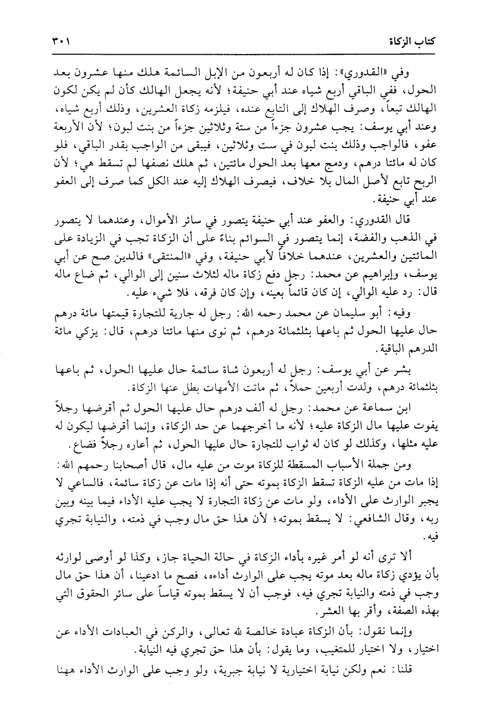 وفي «القدوري» : إذا كان له أربعون من الإبل السائمة هلك منها عشرون بعد الحول، ففي الباقي أربع شياه عند أبي حنيفة؛ لأنه يجعل الهالك كأن لم يكن لكون الهالك تبعاً، وصرف الهلاك إلى التابع عنده، فيلزمه زكاة العشرين، وذلك أربع شياه، وعند أبي يوسف: يجب عشرون جزءاً من ستة وثلاثين جزءاً من بنت لبون؛ لأن الأربعة عفو، فالواجب وذلك بنت لبون في ست وثلاثين، فيبقى من الواجب بقدر الباقي، فلو كان له مائتا درهم، ودمج معها بعد الحول مائتين، ثم هلك نصفها لم تسقط هي؛ لأن الربح تابع لأصل المال بلا خلاف، فيصرف الهلاك إليه عند الكل كما صرف إلى العفو عند أبي حنيفة.