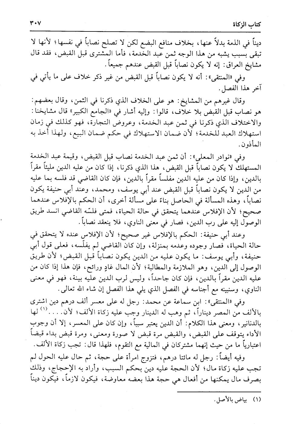 وفي «نوادر المعلى» : أن ثمن عبد الخدمة نصاب قبل القبض، وقيمة عبد الخدمة المستهلك لا يكون نصاباً قبل القبض، هذا الذي ذكرنا، إذا كان من عليه الدين مليئاً مقراً بالدين، وإذا كان من عليه الدين مفلساً مقراً بالدين، فإن كان القاضي قد فلسه بما عليه من الدين لا يكون نصاباً قبل القبض عند أبي يوسف، ومحمد، وعند أبي حنيفة يكون نصاباً، وهذه المسألة في الحاصل بناءً على مسألة أخرى، أن الحكم بالإفلاس عندهما صحيح؛ لأن الإفلاس عندهما يتحقق في حالة الحياة، فمتى فلسّه القاضي انسد طريق الوصول إليه على رب الدين، فصار في معنى الناوي، فلا ينعقد نصاباً.