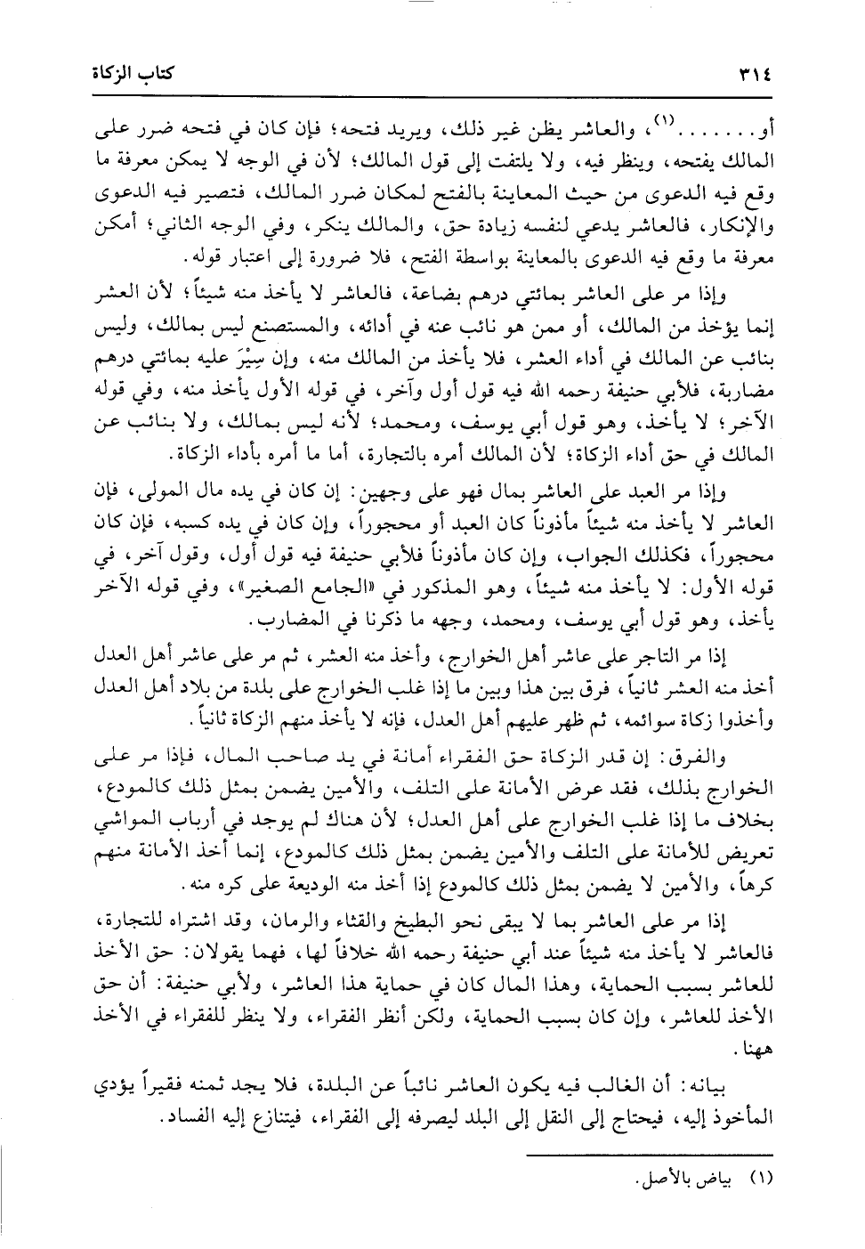 أو.......، والعاشر يظن غير ذلك، ويريد فتحه؛ فإن كان في فتحه ضرر على المالك يفتحه، وينظر فيه، ولا يلتفت إلى قول المالك؛ لأن في الوجه لا يمكن معرفة ما وقع فيه الدعوى من حيث المعاينة بالفتح لمكان ضرر المالك، فتصير فيه الدعوى والإنكار، فالعاشر يدعي لنفسه زيادة حق، والمالك ينكر، وفي الوجه الثاني؛ أمكن معرفة ما وقع فيه الدعوى بالمعاينة بواسطة الفتح، فلا ضرورة إلى اعتبار قوله.