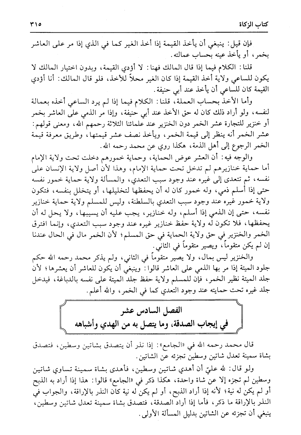 وأما الأخذ بحساب العملة، قلنا: الكلام فيما إذا لم يرد الساعي أخذه بعمالة لنفسه، ولو أراد ذلك كان له حق الأخذ عند أبي حنيفة، وإذا مر الذمي على العاشر بخمر أو خنزير للتجارة عشر الخمر دون الخنزير عند علمائنا الثلاثة رحمهم الله، ومعنى قولهم: عشر الخمر أنه ينظر إلى قيمة الخمر، ويأخذ نصف عشر قيمتها، وطريق معرفة قيمة الخمر الرجوع إلى أهل الذمة، هكذا روي عن محمد رحمه الله.