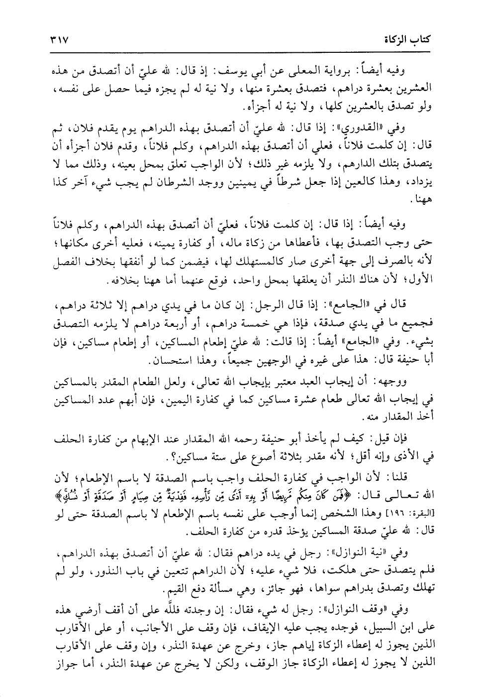 وفيه أيضاً: إذا قال: إن كلمت فلاناً، فعليّ أن أتصدق بهذه الدراهم، وكلم فلاناً حتى وجب التصدق بها، فأعطاها من زكاة ماله، أو كفارة يمينه، فعليه أخرى مكانها؛ لأنه بالصرف إلى جهة أخرى صار كالمستهلك لها، فيضمن كما لو أنفقها بخلاف الفصل الأول؛ لأن هناك النذر أن يعلقها بمحل واحد، فوقع عنهما أما ههنا بخلافه.