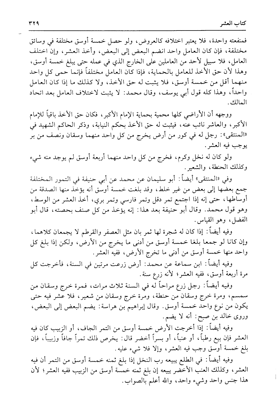 ووجهه أن الأراضي كلها محمية بحماية الإمام الأكبر، فكان حق الأخذ باقياً للإمام الأكبر، والعاشر نائب عنه، فيثبت له حق الأخذ بحكم النيابة، وذكر الحاكم الشهيد في «المنتقى» : رجل له في كور من أرض يخرج من كل واحد منهما وسقان ونصف من بر يوجب فيه العشر.
