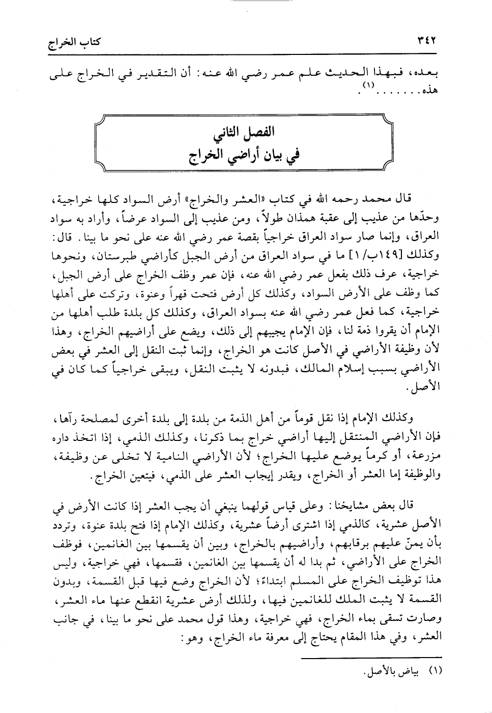 قال محمد رحمه الله في كتاب «العشر والخراج» أرض السواد كلها خراجية، وحدّها من عذيب إلى عقبة همذان طولاً، ومن عذيب إلى السواد عرضاً، وأراد به سواد العراق، وإنما صار سواد العراق خراجياً بقصة عمر رضي الله عنه على نحو ما بينا. قال: وكذلك (149ب1) ما في سواد العراق من أرض الجبل كأراضي طبرستان، ونحوها خراجية، عرف ذلك بفعل عمر رضي الله عنه، فإن عمر وظف الخراج على أرض الجبل، كما وظف على الأرض السواد، وكذلك كل أرض فتحت قهراً وعنوة، وتركت على أهلها خراجية، كما فعل عمر رضي الله عنه بسواد العراق، وكذلك كل بلدة طلب أهلها من الإمام أن يقروا ذمة لنا، فإن الإمام يجيبهم إلى ذلك، ويضع على أراضيهم الخراج، وهذا لأن وظيفة الأراضي في الأصل كانت هو الخراج، وإنما ثبت النقل إلى العشر في بعض الأراضي بسبب إسلام المالك، فبدونه لا يثبت النقل، ويبقى خراجياً كما كان في الأصل.